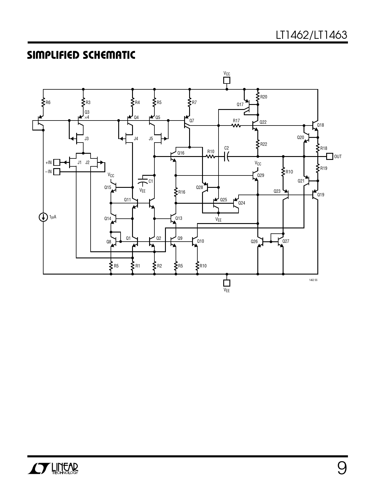 VCC R20 R6 R3 R4 R5 R7 Q17 Q3 ×4 Q4 Q5 Q7 R17 Q22 Q18 J3 J4 J5 Q20 R22 C2 R18 Q16 R10 OUT +IN J1 J2 VCC R19 – IN R1O VCC Q29 C1 Q21 Q15 Q28 VEE R16 Q23 Q19 Q11 Q25 Q24 1µA Q14 Q13 VEE Q1 Q2 Q9 Q8 Q10 Q26 Q27 R5 R1 R2 R5 R10 1462 SS VEE 9
