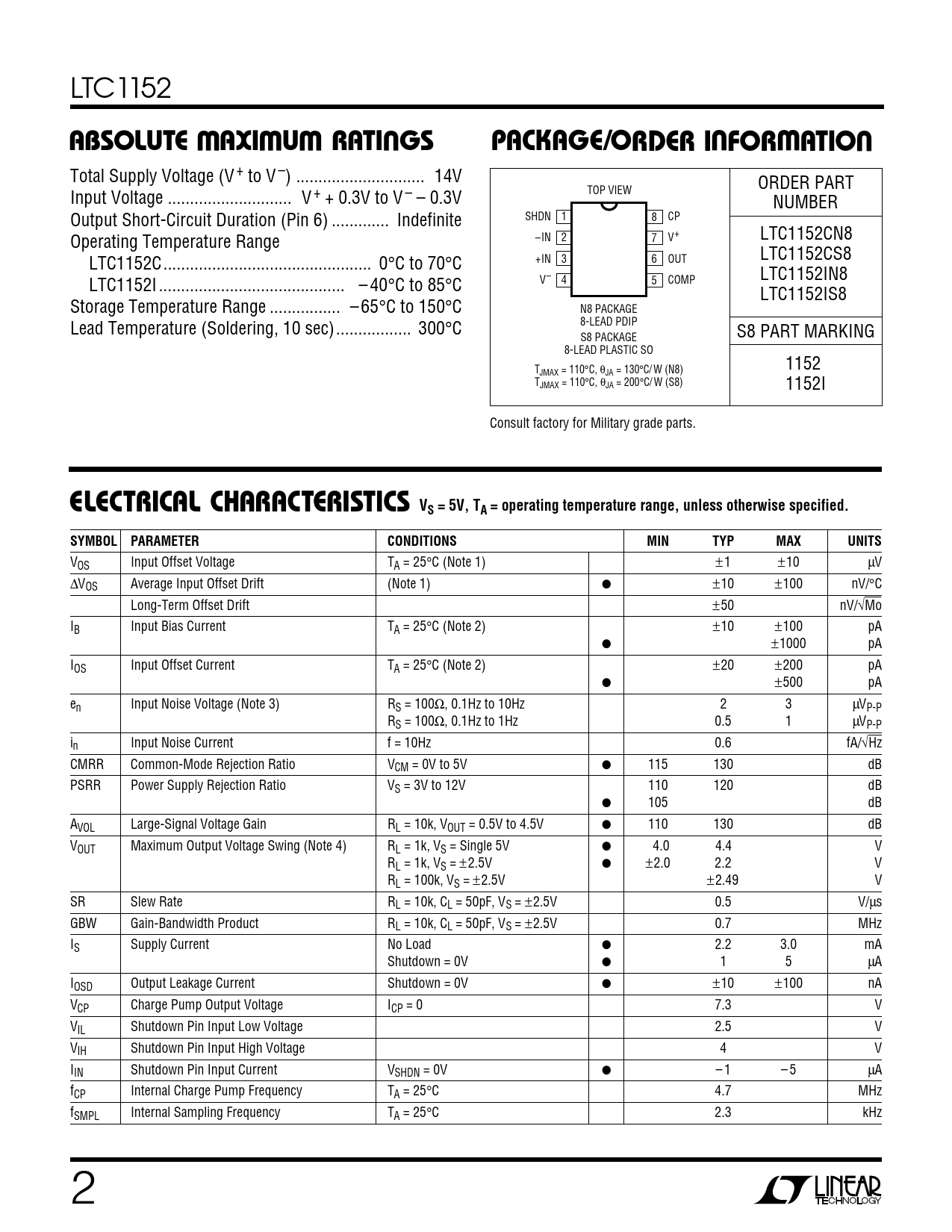 LTC1152 WWWUUWUABSOLUTEAXI UAR TI GSPACKAGE/ORDER I FOR ATIO Total Supply Voltage (V + to V –) ... 14V ORDER PART Input Voltage .. V + + 0.3V to V – – 0.3V TOP VIEW NUMBER Output Short-Circuit Duration (Pin 6) ... Indefinite SHDN 1 8 CP –IN 2 7 V+ LTC1152CN8 Operating Temperature Range +IN 3 OUT LTC1152CS8 LTC1152C... 0°C to 70°C 6 LTC1152IN8 LTC1152I .. – 40°C to 85°C V– 4 5 COMP LTC1152IS8 Storage Temperature Range .. – 65°C to 150°C N8 PACKAGE Lead Temperature (Soldering, 10 sec)... 300°C 8-LEAD PDIP S8 PART MARKING S8 PACKAGE 8-LEAD PLASTIC SO 1152 TJMAX = 110°C, θJA = 130°C/ W (N8) TJMAX = 110°C, θJA = 200°C/ W (S8) 1152I Consult factory for Military grade parts. ELECTRICAL CHAR CA TERISTICS VS = 5V, TA = operating temperature range, unless otherwise specified.SYMBOLPARAMETERCONDITIONSMINTYPMAXUNITS VOS Input Offset Voltage TA = 25°C (Note 1) ±1 ±10 µV ∆VOS Average Input Offset Drift (Note 1) ● ±10 ±100 nV/°C Long-Term Offset Drift ±50 nV/√Mo IB Input Bias Current TA = 25°C (Note 2) ±10 ±100 pA ● ±1000 pA IOS Input Offset Current TA = 25°C (Note 2) ±20 ±200 pA ● ±500 pA en Input Noise Voltage (Note 3) RS = 100Ω, 0.1Hz to 10Hz 2 3 µVP-P RS = 100Ω, 0.1Hz to 1Hz 0.5 1 µVP-P in Input Noise Current f = 10Hz 0.6 fA/√Hz CMRR Common-Mode Rejection Ratio VCM = 0V to 5V ● 115 130 dB PSRR Power Supply Rejection Ratio VS = 3V to 12V 110 120 dB ● 105 dB AVOL Large-Signal Voltage Gain RL = 10k, VOUT = 0.5V to 4.5V ● 110 130 dB VOUT Maximum Output Voltage Swing (Note 4) RL = 1k, VS = Single 5V ● 4.0 4.4 V RL = 1k, VS = ±2.5V ● ±2.0 2.2 V RL = 100k, VS = ±2.5V ±2.49 V SR Slew Rate RL = 10k, CL = 50pF, VS = ±2.5V 0.5 V/µs GBW Gain-Bandwidth Product RL = 10k, CL = 50pF, VS = ±2.5V 0.7 MHz IS Supply Current No Load ● 2.2 3.0 mA Shutdown = 0V ● 1 5 µA IOSD Output Leakage Current Shutdown = 0V ● ±10 ±100 nA VCP Charge Pump Output Voltage ICP = 0 7.3 V VIL Shutdown Pin Input Low Voltage 2.5 V VIH Shutdown Pin Input High Voltage 4 V IIN Shutdown Pin Input Current VSHDN = 0V ● – 1 – 5 µA fCP Internal Charge Pump Frequency TA = 25°C 4.7 MHz fSMPL Internal Sampling Frequency TA = 25°C 2.3 kHz 2