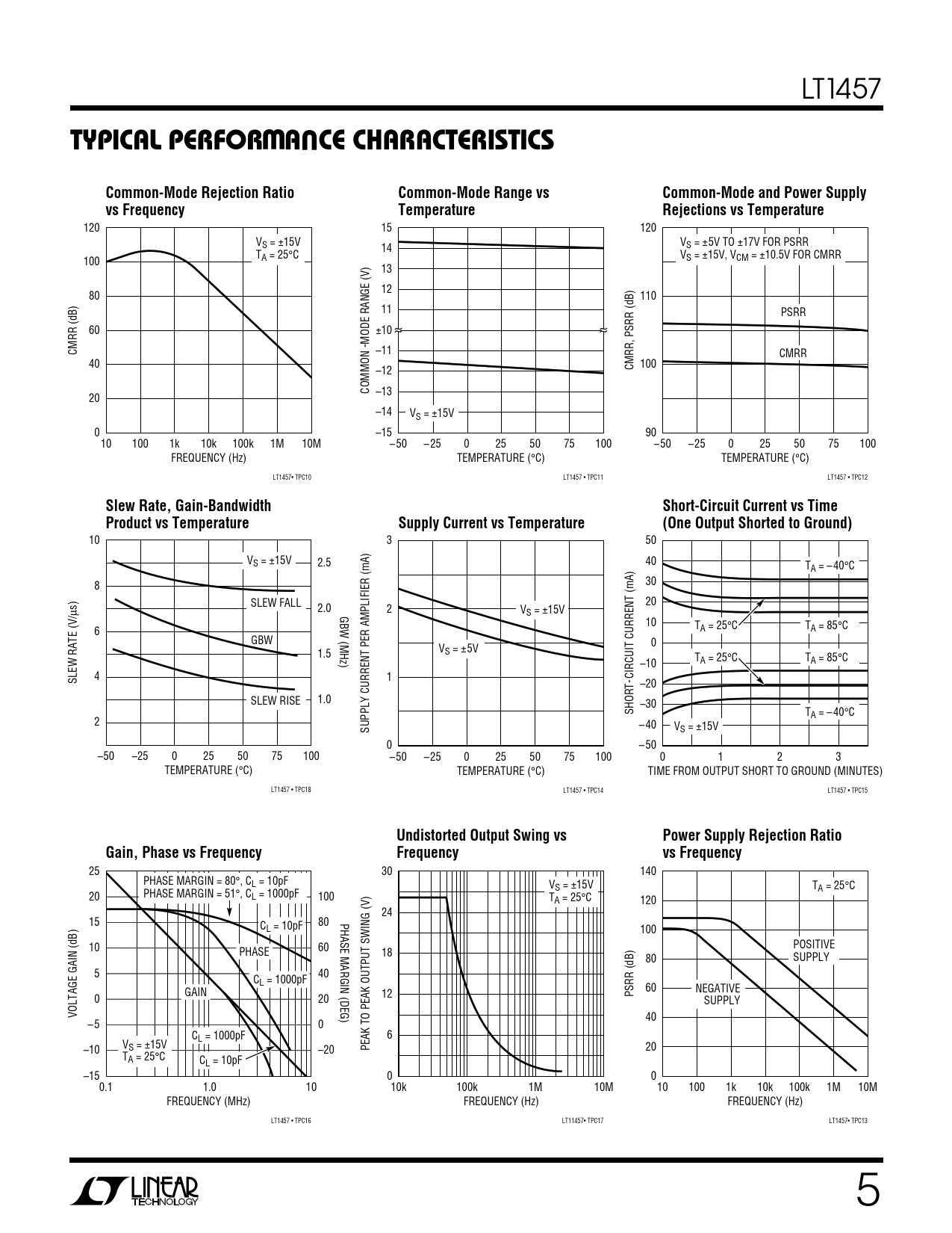 25 30 140 PHASE MARGIN = 80°, CL = 10pF VS = ±15V TA = 25°C 20 PHASE MARGIN = 51°, CL = 1000pF 100 TA = 25°C 120 24 15 80 PHASE MARGIN (DEG) CL = 10pF 100 10 60 POSITIVE PHASE 18 80 SUPPLY 5 40 CL = 1000pF GAIN 60 PSRR (dB) NEGATIVE 0 20 12 SUPPLY VOLTAGE GAIN (dB) 40 – 5 0 CL = 1000pF 6 V –10 S = ±15V –20 PEAK TO PEAK OUTPUT SWING (V) 20 TA = 25°C CL = 10pF –15 0 0 0.1 1.0 10 10k 100k 1M 10M 10 100 1k 10k 100k 1M 10M FREQUENCY (MHz) FREQUENCY (Hz) FREQUENCY (Hz) LT1457 • TPC16 LT11457• TPC17 LT1457• TPC13 5