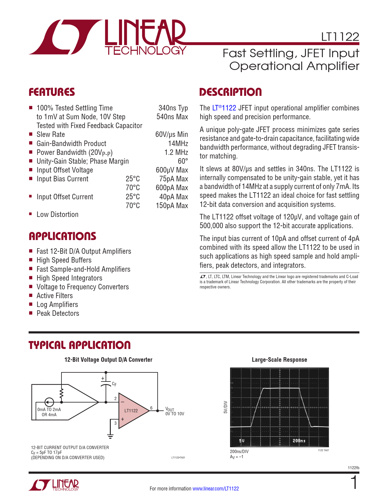 LT1122 Fast Settling, JFET Input Operational Amplifier FEATURESDESCRIPTION n 100% Tested Settling Time 340ns Typ The LT®1122 JFET input operational amplifier combines to 1mV at Sum Node, 10V Step 540ns Max high speed and precision performance. Tested with Fixed Feedback Capacitor A unique poly-gate JFET process minimizes gate series n Slew Rate 60V/µs Min resistance and gate-to-drain capacitance, facilitating wide n Gain-Bandwidth Product 14MHz bandwidth performance, without degrading JFET transis- n Power Bandwidth (20VP-P) 1.2 MHz tor matching. n Unity-Gain Stable; Phase Margin 60° n Input Offset Voltage 600µV Max It slews at 80V/µs and settles in 340ns. The LT1122 is n Input Bias Current 25°C 75pA Max internally compensated to be unity-gain stable, yet it has 70°C 600pA Max a bandwidth of 14MHz at a supply current of only 7mA. Its ■ Input Offset Current 25°C 40pA Max speed makes the LT1122 an ideal choice for fast settling 70°C 150pA Max 12-bit data conversion and acquisition systems. ■ Low Distortion The LT1122 offset voltage of 120µV, and voltage gain of 500,000 also support the 12-bit accurate applications. APPLICATIONS The input bias current of 10pA and offset current of 4pA combined with its speed allow the LT1122 to be used in n Fast 12-Bit D/A Output Amplifiers such applications as high speed sample and hold ampli- n High Speed Buffers fiers, peak detectors, and integrators. n Fast Sample-and-Hold Amplifiers n High Speed Integrators L, LT, LTC, LTM, Linear Technology and the Linear logo are registered trademarks and C-Load is a trademark of Linear Technology Corporation. All other trademarks are the property of their n Voltage to Frequency Converters respective owners. n Active Filters n Log Amplifiers n Peak Detectors TYPICAL APPLICATION12-Bit Voltage Output D/A ConverterLarge-Scale Response + CF 2 – 0mA TO 2mA 6 V LT1122 OUT 5V/DIV OR 4mA 0V TO 10V + 3 12-BIT CURRENT OUTPUT D/A CONVERTER C 1122 TA07 F = 5pF TO 17pF 200ns/DIV (DEPENDING ON D/A CONVERTER USED) LT1122•TA01 AV = –1 1122fb For more information www.linear.com/LT1122 1