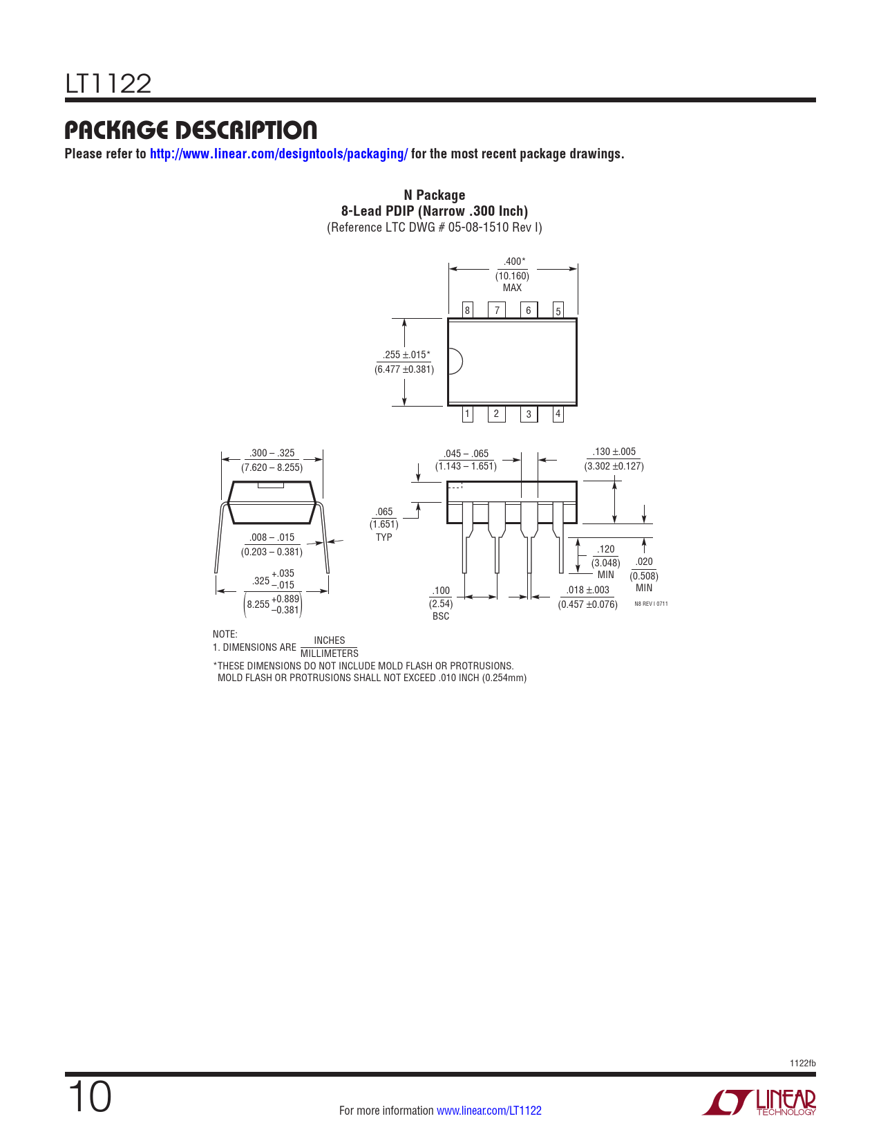 (Reference LTC DWG # 05-08-1510 Rev I) .400* (10.160) MAX 8 7 6 5 .255 ±.015* (6.477 ±0.381) 1 2 3 4 .300 – .325 .045 – .065 .130 ±.005 (7.620 – 8.255) (1.143 – 1.651) (3.302 ±0.127) .065 (1.651) .008 – .015 TYP .120 (0.203 – 0.381) (3.048) .020 +.035 MIN (0.508) .325 –.015 .100 .018 MIN ±.003 +0.889 (2.54) N8 REV I 0711 8.255 (0.457 ±0.076) ( ) –0.381 BSC NOTE: INCHES 1. DIMENSIONS ARE MILLIMETERS *THESE DIMENSIONS DO NOT INCLUDE MOLD FLASH OR PROTRUSIONS. MOLD FLASH OR PROTRUSIONS SHALL NOT EXCEED .010 INCH (0.254mm) 1122fb 10 For more information www.linear.com/LT1122