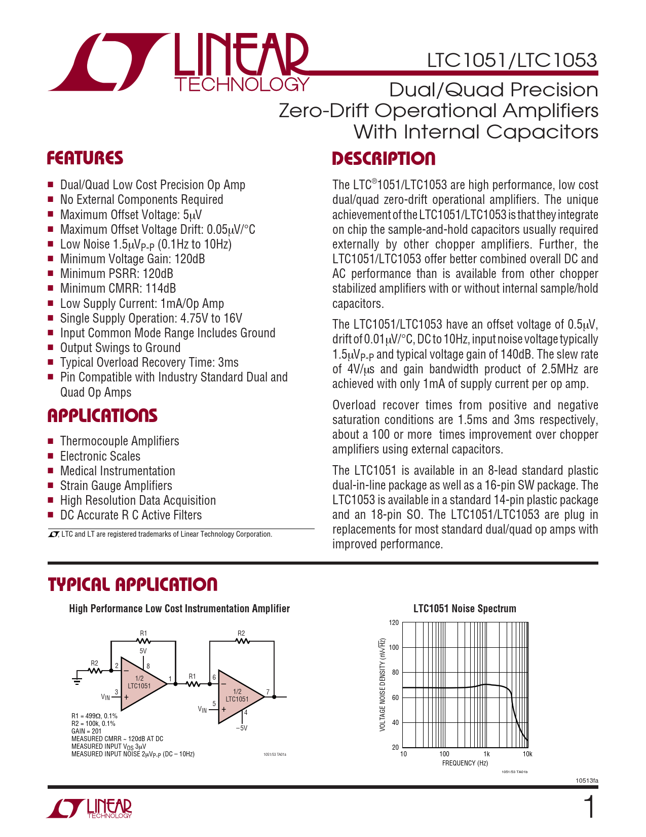 LTC1051/LTC1053 Dual/Quad Precision Zero-Drift Operational Amplifiers With Internal Capacitors UFEATURESDESCRIPTIO ■ Dual/Quad Low Cost Precision Op Amp The LTC®1051/LTC1053 are high performance, low cost ■ No External Components Required dual/quad zero-drift operational amplifiers. The unique ■ Maximum Offset Voltage: 5µV achievement of the LTC1051/LTC1053 is that they integrate ■ Maximum Offset Voltage Drift: 0.05µV/°C on chip the sample-and-hold capacitors usually required ■ Low Noise 1.5µV externally by other chopper amplifiers. Further, the P-P (0.1Hz to 10Hz) ■ Minimum Voltage Gain: 120dB LTC1051/LTC1053 offer better combined overall DC and ■ Minimum PSRR: 120dB AC performance than is available from other chopper ■ Minimum CMRR: 114dB stabilized amplifiers with or without internal sample/hold ■ Low Supply Current: 1mA/Op Amp capacitors. ■ Single Supply Operation: 4.75V to 16V The LTC1051/LTC1053 have an offset voltage of 0.5µV, ■ Input Common Mode Range Includes Ground drift of 0.01µV/°C, DC to 10Hz, input noise voltage typically ■ Output Swings to Ground 1.5µVP-P and typical voltage gain of 140dB. The slew rate ■ Typical Overload Recovery Time: 3ms of 4V/µs and gain bandwidth product of 2.5MHz are ■ Pin Compatible with Industry Standard Dual and achieved with only 1mA of supply current per op amp. Quad Op Amps U Overload recover times from positive and negative APPLICATIO S saturation conditions are 1.5ms and 3ms respectively, about a 100 or more times improvement over chopper ■ Thermocouple Amplifiers amplifiers using external capacitors. ■ Electronic Scales ■ Medical Instrumentation The LTC1051 is available in an 8-lead standard plastic ■ Strain Gauge Amplifiers dual-in-line package as well as a 16-pin SW package. The ■ High Resolution Data Acquisition LTC1053 is available in a standard 14-pin plastic package ■ DC Accurate R C Active Filters and an 18-pin SO. The LTC1051/LTC1053 are plug in replacements for most standard dual/quad op amps with , LTC and LT are registered trademarks of Linear Technology Corporation. improved performance. UTYPICAL APPLICATIOHigh Performance Low Cost Instrumentation AmplifierLTC1051 Noise Spectrum 120 R1 R2 Hz) √ 100 5V R2 2 – 8 80 1/2 R1 1 6 LTC1051 – 3 1/2 7 VIN + 60 LTC1051 5 VIN + 4 R1 = 499Ω, 0.1% R2 = 100k, 0.1% 40 – 5V VOLTAGE NOISE DENSITY (nV GAIN = 201 MEASURED CMRR ~ 120dB AT DC MEASURED INPUT VOS 3µV 20 1051/53 TA01a MEASURED INPUT NOISE 2µV 10 100 1k 10k P-P (DC – 10Hz) FREQUENCY (Hz) 1051/53 TA01b 10513fa 1