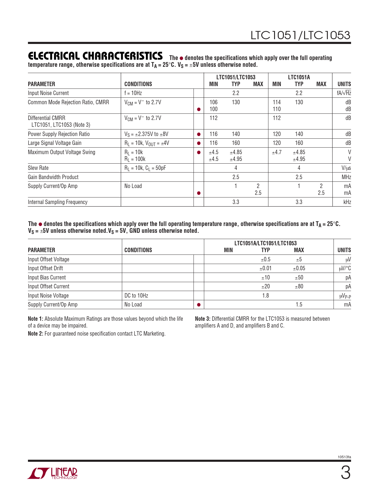 LTC1051/LTC1053 ELECTRICAL CHARACTERISTICS The ● denotes the specifications which apply over the full operating temperature range, otherwise specifications are at TA = 25 ° C. VS = ± 5V unless otherwise noted.LTC1051/LTC1053LTC1051APARAMETERCONDITIONSMINTYPMAXMINTYPMAXUNITS Input Noise Current f = 10Hz 2.2 2.2 fA/√Hz Common Mode Rejection Ratio, CMRR VCM = V– to 2.7V 106 130 114 130 dB ● 100 110 dB Differential CMRR VCM = V– to 2.7V 112 112 dB LTC1051, LTC1053 (Note 3) Power Supply Rejection Ratio VS = ±2.375V to ±8V ● 116 140 120 140 dB Large Signal Voltage Gain RL = 10k, VOUT = ±4V ● 116 160 120 160 dB Maximum Output Voltage Swing RL = 10k ● ±4.5 ±4.85 ±4.7 ±4.85 V RL = 100k ±4.5 ±4.95 ±4.95 V Slew Rate RL = 10k, CL = 50pF 4 4 V/µs Gain Bandwidth Product 2.5 2.5 MHz Supply Current/Op Amp No Load 1 2 1 2 mA ● 2.5 2.5 mA Internal Sampling Frequency 3.3 3.3 kHz The ● denotes the specifications which apply over the full operating temperature range, otherwise specifications are at TA = 25 ° C.VS = ± 5V unless otherwise noted.VS = 5V, GND unless otherwise noted.LTC1051A/LTC1051/LTC1053PARAMETERCONDITIONSMINTYPMAXUNITS Input Offset Voltage ±0.5 ±5 µV Input Offset Drift ±0.01 ±0.05 µV/°C Input Bias Current ±10 ±50 pA Input Offset Current ±20 ±80 pA Input Noise Voltage DC to 10Hz 1.8 µVP-P Supply Current/Op Amp No Load ● 1.5 mA Note 1: Absolute Maximum Ratings are those values beyond which the life Note 3: Differential CMRR for the LTC1053 is measured between of a device may be impaired. amplifiers A and D, and amplifiers B and C. Note 2: For guaranteed noise specification contact LTC Marketing. 10513fa 3