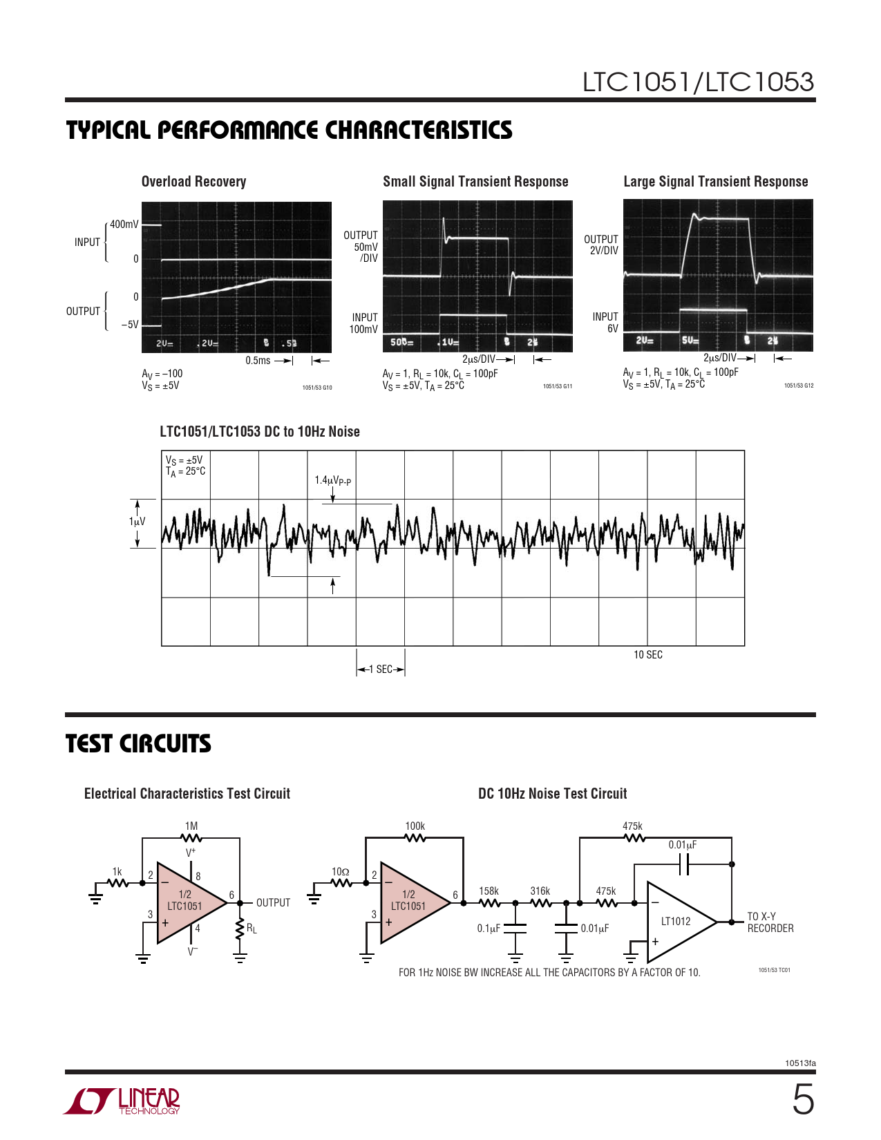 1M 100k 475k 0.01µF V+ 1k 10Ω 2 8 2 – – 1/2 6 1/2 158k 316k 475k 6 LTC1051 OUTPUT LTC1051 – 3 3 + + TO X-Y LT1012 4 RL 0.1µF 0.01µF RECORDER + V– 1051/53 TC01 FOR 1Hz NOISE BW INCREASE ALL THE CAPACITORS BY A FACTOR OF 10. 10513fa 5