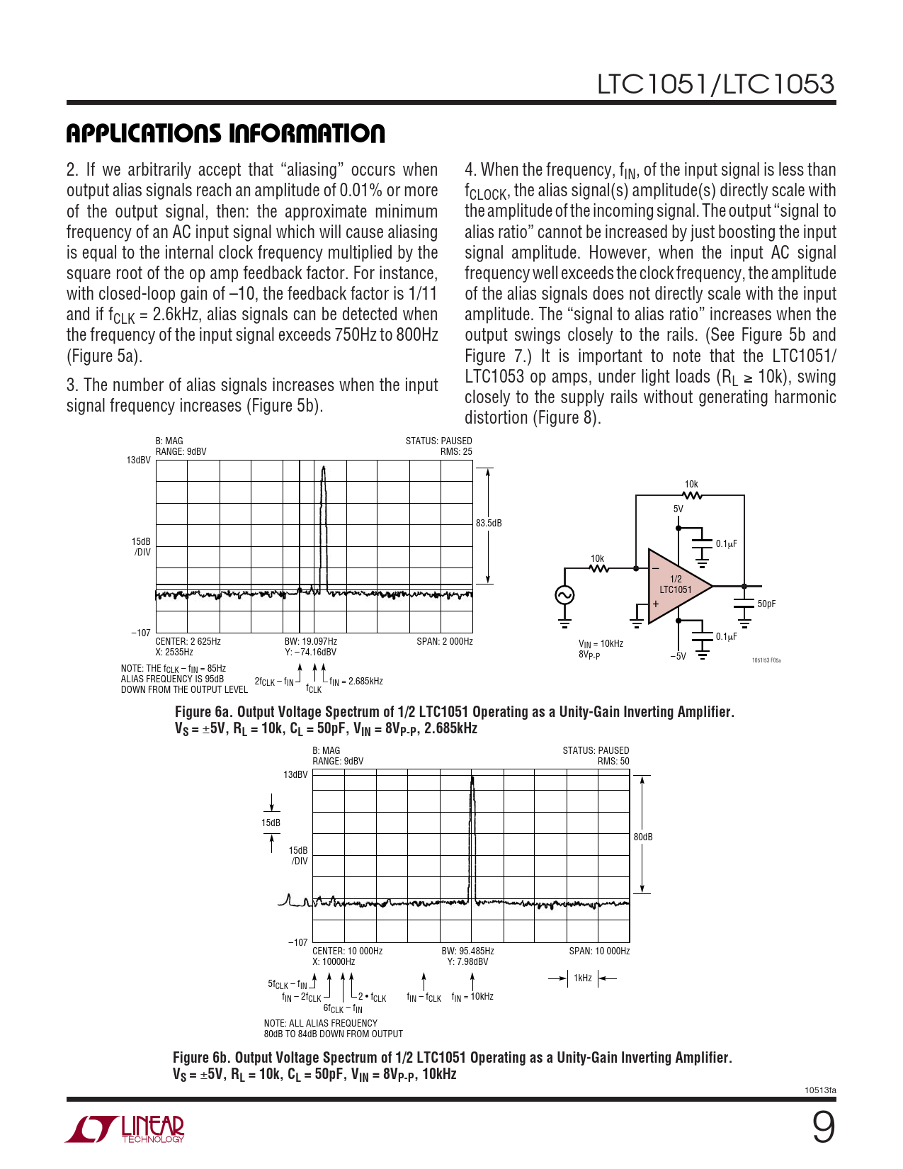 LTC1051/LTC1053 UUWUAPPLICATIO S I FOR ATIO 2. If we arbitrarily accept that “aliasing” occurs when 4. When the frequency, fIN, of the input signal is less than output alias signals reach an amplitude of 0.01% or more fCLOCK, the alias signal(s) amplitude(s) directly scale with of the output signal, then: the approximate minimum the amplitude of the incoming signal. The output “signal to frequency of an AC input signal which will cause aliasing alias ratio” cannot be increased by just boosting the input is equal to the internal clock frequency multiplied by the signal amplitude. However, when the input AC signal square root of the op amp feedback factor. For instance, frequency well exceeds the clock frequency, the amplitude with closed-loop gain of –10, the feedback factor is 1/11 of the alias signals does not directly scale with the input and if fCLK = 2.6kHz, alias signals can be detected when amplitude. The “signal to alias ratio” increases when the the frequency of the input signal exceeds 750Hz to 800Hz output swings closely to the rails. (See Figure 5b and (Figure 5a). Figure 7.) It is important to note that the LTC1051/ LTC1053 op amps, under light loads (R 3. The number of alias signals increases when the input L ≥ 10k), swing closely to the supply rails without generating harmonic signal frequency increases (Figure 5b). distortion (Figure 8). B: MAG STATUS: PAUSED RANGE: 9dBV RMS: 25 13dBV 10k 5V 83.5dB 15dB 0.1µF /DIV 10k – 1/2 LTC1051 + 50pF –107 0.1 CENTER: 2 625Hz BW: 19.097Hz SPAN: 2 000Hz µF VIN = 10kHz X: 2535Hz Y: – 74.16dBV 8VP-P – 5V 1051/53 F05a NOTE: THE fCLK – fIN = 85Hz ALIAS FREQUENCY IS 95dB 2f f CLK – fIN IN = 2.685kHz f DOWN FROM THE OUTPUT LEVEL CLK Figure 6a. Output Voltage Spectrum of 1/2 LTC1051 Operating as a Unity-Gain Inverting Amplifier. VS = ± 5V, RL = 10k, CL = 50pF, VIN = 8VP-P, 2.685kHz B: MAG STATUS: PAUSED RANGE: 9dBV RMS: 50 13dBV 15dB 80dB 15dB /DIV –107 CENTER: 10 000Hz BW: 95.485Hz SPAN: 10 000Hz X: 10000Hz Y: 7.98dBV 1kHz 5fCLK – fIN fIN – 2fCLK 2 • f f f CLK IN – fCLK IN = 10kHz 6fCLK – fIN NOTE: ALL ALIAS FREQUENCY 80dB TO 84dB DOWN FROM OUTPUT Figure 6b. Output Voltage Spectrum of 1/2 LTC1051 Operating as a Unity-Gain Inverting Amplifier. VS = ± 5V, RL = 10k, CL = 50pF, VIN = 8VP-P, 10kHz 10513fa 9