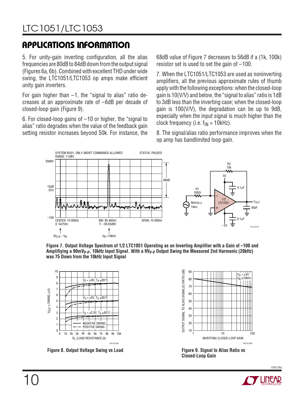 LTC1051/LTC1053 UUWUAPPLICATIO S I FOR ATIO 5. For unity-gain inverting configuration, all the alias 68dB value of Figure 7 decreases to 56dB if a (1k, 100k) frequencies are 80dB to 84dB down from the output signal resistor set is used to set the gain of –100. (Figures 6a, 6b). Combined with excellent THD under wide 7. When the LTC1051/LTC1053 are used as noninverting swing, the LTC1051/LTC1053 op amps make efficient amplifiers, all the previous approximate rules of thumb unity gain inverters. apply with the following exceptions: when the closed-loop For gain higher than –1, the “signal to alias” ratio de- gain is 10(V/V) and below, the “signal to alias” ratio is 1dB creases at an approximate rate of –6dB per decade of to 3dB less than the inverting case; when the closed-loop closed-loop gain (Figure 9). gain is 100(V/V), the degradation can be up to 9dB, especially when the input signal is much higher than the 6. For closed-loop gains of –10 or higher, the “signal to clock frequency (i.e. f alias” ratio degrades when the value of the feedback gain IN = 10kHz). setting resistor increases beyond 50k. For instance, the 8. The signal/alias ratio performance improves when the op amp has bandlimited loop gain. SYSTEM BUSY, ONLY ABORT COMMANDS ALLOWED STATUS: PAUSED RANGE: 11dBV 20dBV R2 10k 5V 68dB 15dB 0.1µF /DIV R1 100Ω – 1/2 90mV V P-P LTC1051 OUT 10kHz + 50pF –100 0.1 CENTER: 10 000Hz BW: 95.485Hz SPAN: 10 000Hz µF X: 5475Hz Y: –58.05dBV – 5V 1051/53 F07 6f f CLK – fIN IN =10kHz Figure 7. Output Voltage Spectrum of 1/2 LTC1051 Operating as an Inverting Amplifier with a Gain of –100 and Amplifiying a 90mVP-P, 10kHz Input Signal. With a 9VP-P Output Swing the Measured 2nd Harmonic (20kHz)was 75 Down from the 10kHz Input Signal 10 90 VS = ±5V 9 f V 80 IN ≤10kHz S = ±8V, TA ≤85°C 8 70 V) 7 ± 6 60 VS = ±5V, TA ≤85°C 5 50 SWING ( ± 4 40 OUTV 3 VS = ±2.5V, TA ≤85°C 30 2 NEGATIVE SWING 1 20 POSITIVE SWING 0 OUTPUT SIGNAL TO ALIAS SIGNAL(S) RATIO (dB) 10 0 1k 2k 3k 4k 5k 6k 7k 8k 9k 10k 1 10 100 RL (LOAD RESISTANCE,Ω) INVERTING CLOSED-LOOP GAIN 1051/53 G08 1051/53 G09 Figure 8. Output Voltage Swing vs LoadFigure 9. Signal to Alias Ratio vs Closed-Loop Gain 10513fa 10