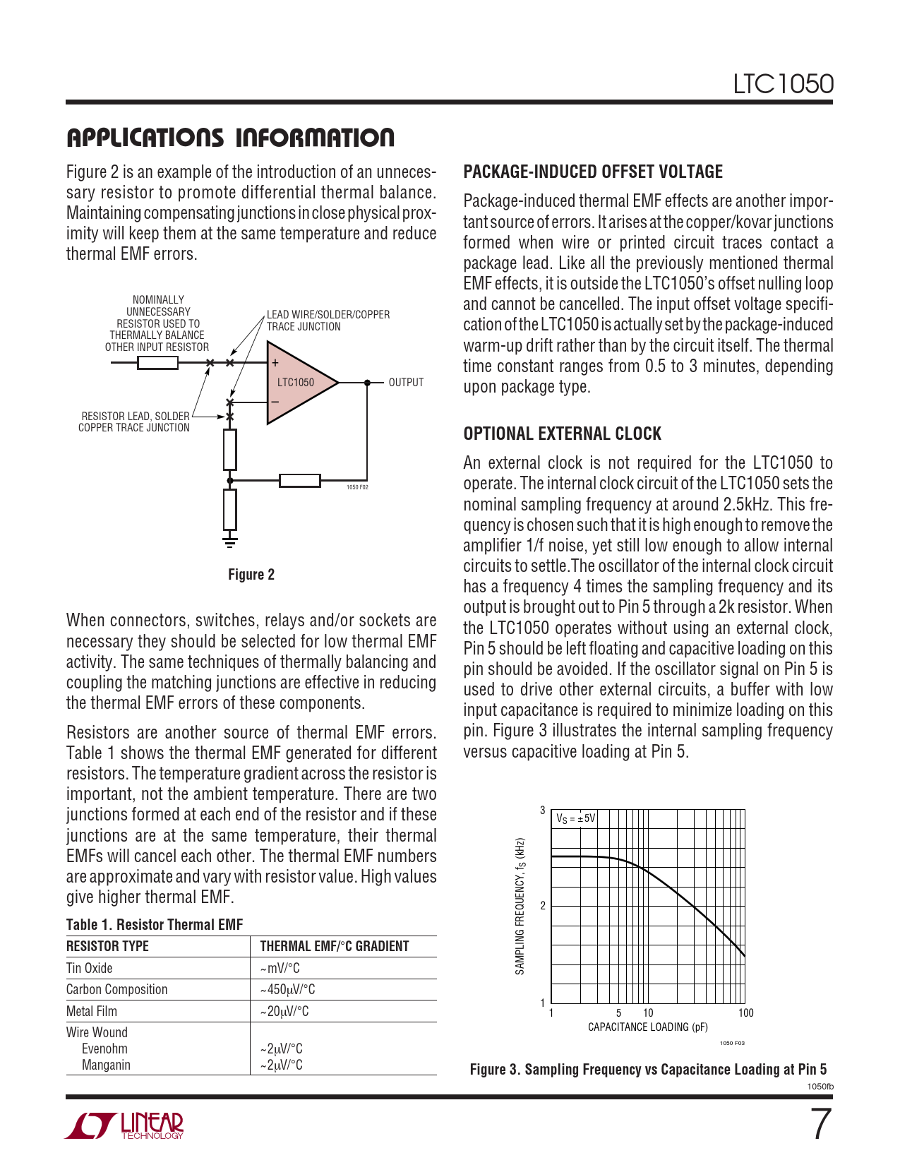has a frequency 4 times the sampling frequency and its output is brought out to Pin 5 through a 2k resistor. When When connectors, switches, relays and/or sockets are the LTC1050 operates without using an external clock, necessary they should be selected for low thermal EMF Pin 5 should be left floating and capacitive loading on this activity. The same techniques of thermally balancing and pin should be avoided. If the oscillator signal on Pin 5 is coupling the matching junctions are effective in reducing used to drive other external circuits, a buffer with low the thermal EMF errors of these components. input capacitance is required to minimize loading on this Resistors are another source of thermal EMF errors. pin. Figure 3 illustrates the internal sampling frequency Table 1 shows the thermal EMF generated for different versus capacitive loading at Pin 5. resistors. The temperature gradient across the resistor is important, not the ambient temperature. There are two junctions formed at each end of the resistor and if these 3 VS = ± 5V junctions are at the same temperature, their thermal EMFs will cancel each other. The thermal EMF numbers (kHz) S are approximate and vary with resistor value. High values give higher thermal EMF. 2