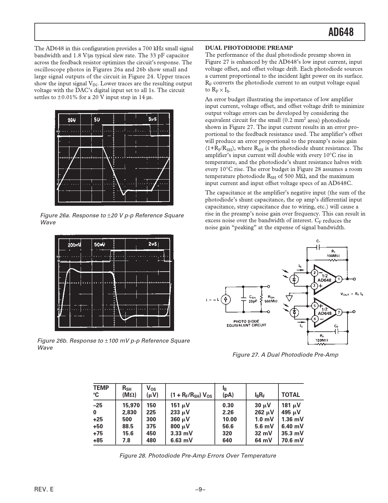 AD648 The AD648 in this configuration provides a 700 kHz small signal DUAL PHOTODIODE PREAMP bandwidth and 1.8 V/ The performance of the dual photodiode preamp shown in µs typical slew rate. The 33 pF capacitor across the feedback resistor optimizes the circuit’s response. The Figure 27 is enhanced by the AD648’s low input current, input oscilloscope photos in Figures 26a and 26b show small and voltage offset, and offset voltage drift. Each photodiode sources large signal outputs of the circuit in Figure 24. Upper traces a current proportional to the incident light power on its surface. show the input signal V R IN. Lower traces are the resulting output F converts the photodiode current to an output voltage equal voltage with the DAC’s digital input set to all 1s. The circuit to RF × IS. settles to ± 0.01% for a 20 V input step in 14 µs. An error budget illustrating the importance of low amplifier input current, voltage offset, and offset voltage drift to minimize output voltage errors can be developed by considering the equivalent circuit for the small (0.2 mm2 area) photodiode shown in Figure 27. The input current results in an error pro- portional to the feedback resistance used. The amplifier’s offset will produce an error proportional to the preamp’s noise gain (1+RF/RSH), where RSH is the photodiode shunt resistance. The amplifier’s input current will double with every 10°C rise in temperature, and the photodiode’s shunt resistance halves with every 10°C rise. The error budget in Figure 28 assumes a room temperature photodiode RSH of 500 MΩ, and the maximum input current and input offset voltage specs of an AD648C. The capacitance at the amplifier’s negative input (the sum of the photodiode’s shunt capacitance, the op amp’s differential input capacitance, stray capacitance due to wiring, etc.) will cause a rise in the preamp’s noise gain over frequency. This can result in Figure 26a. Response to ±20 V p-p Reference Square excess noise over the bandwidth of interest. CF reduces the Wave noise gain “peaking” at the expense of signal bandwidth. Figure 26b. Response to ±100 mV p-p Reference Square Wave Figure 27. A Dual Photodiode Pre-Amp TEMPRSHVOSIB ⴗ C(M ⍀ )( V)(1 + RF/RSH) VOS(pA)IBRFTOTAL–2515,970150151 V0.3030 V181 V02,830225233 V2.26262 V495 V+25500300360 V10.001.0 mV1.36 mV+5088.5375800 V56.65.6 mV6.40 mV+7515.64503.33 mV32032 mV35.3 mV+857.84806.63 mV64064 mV70.6 mV Figure 28. Photodiode Pre-Amp Errors Over Temperature REV. E –9–