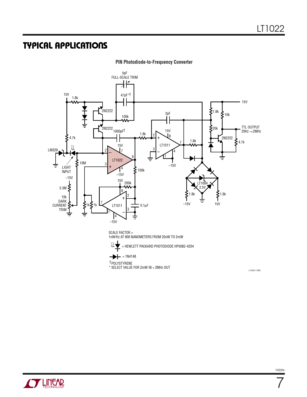 5pF FULL-SCALE TRIM 15V 47pF*† 1.8k 15V 2N2222 1.8k 2pF 10k 100k 2N2222 20k TTL OUTPUT 1000pF† 15V ← 20Hz 2MHz 1.8k 2 8 4.7k + 2N2222 7 1.8k 4.7k 15V LT1011 3 LM329 2 7 4 – – 1 6 LT1022 10M 3 LIGHT + –15V 4 100k INPUT –15V –15V 15V 200k LT1004 3.3M 2.5V 8 1.8k 1.8k + 2 10k DARK 7 –15V 15V CURRENT 1k 1k LT1011 0.1µF TRIM – 3 1 4 –15V SCALE FACTOR = 1nW/Hz AT 900 NANOMETERS FROM 20nW TO 2mW = HEWLETT PACKARD PHOTODIODE HP5082-4204 = 1N4148 POL † YSTYRENE * SELECT VALUE FOR 2mW IN = 2MHz OUT LT1022 • TA05 1022fa 7