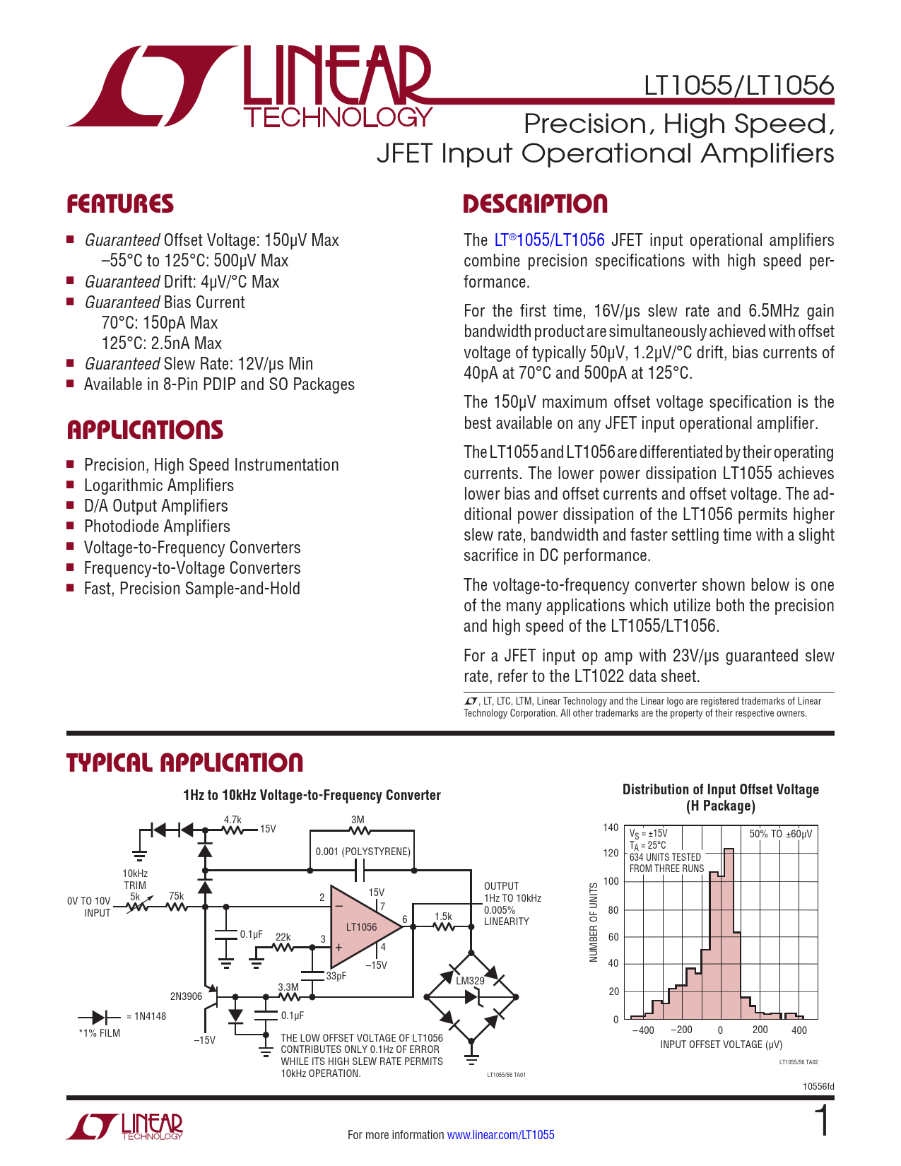 LT1055/LT1056 Precision, High Speed, JFET Input Operational Amplifiers FEATURESDESCRIPTION n Guaranteed Offset Voltage: 150µV Max The LT®1055/LT1056 JFET input operational amplifiers –55°C to 125°C: 500µV Max combine precision specifications with high speed per- n Guaranteed Drift: 4µV/°C Max formance. n Guaranteed Bias Current For the first time, 16V/µs slew rate and 6.5MHz gain 70°C: 150pA Max bandwidth product are simultaneously achieved with offset 125°C: 2.5nA Max voltage of typically 50µV, 1.2µV/°C drift, bias currents of n Guaranteed Slew Rate: 12V/µs Min 40pA at 70°C and 500pA at 125°C. n Available in 8-Pin PDIP and SO Packages The 150µV maximum offset voltage specification is the best available on any JFET input operational amplifier. APPLICATIONS The LT1055 and LT1056 are differentiated by their operating n Precision, High Speed Instrumentation currents. The lower power dissipation LT1055 achieves n Logarithmic Amplifiers lower bias and offset currents and offset voltage. The ad- n D/A Output Amplifiers ditional power dissipation of the LT1056 permits higher n Photodiode Amplifiers slew rate, bandwidth and faster settling time with a slight n Voltage-to-Frequency Converters sacrifice in DC performance. n Frequency-to-Voltage Converters n Fast, Precision Sample-and-Hold The voltage-to-frequency converter shown below is one of the many applications which utilize both the precision and high speed of the LT1055/LT1056. For a JFET input op amp with 23V/µs guaranteed slew rate, refer to the LT1022 data sheet. L, LT, LTC, LTM, Linear Technology and the Linear logo are registered trademarks of Linear Technology Corporation. All other trademarks are the property of their respective owners. TYPICAL APPLICATIONDistribution of Input Offset Voltage1Hz to 10kHz Voltage-to-Frequency Converter(H Package) 4.7k 3M 15V 140 VS = ±15V 50% TO ±60µV 0.001 (POLYSTYRENE) T 120 A = 25°C 634 UNITS TESTED 10kHz FROM THREE RUNS TRIM 100 15V OUTPUT 0V TO 10V 5k 75k 2 – 1Hz TO 10kHz INPUT 7 0.005% 80 6 1.5k LINEARITY LT1056 0.1µF 22k 3 60 + 4 –15V NUMBER OF UNITS 40 33pF LM329 3.3M 2N3906 20 = 1N4148 0.1µF 0 *1% FILM –400 –200 0 200 400 –15V THE LOW OFFSET VOLTAGE OF LT1056 CONTRIBUTES ONLY 0.1Hz OF ERROR INPUT OFFSET VOLTAGE (µV) WHILE ITS HIGH SLEW RATE PERMITS LT1055/56 TA02 10kHz OPERATION. LT1055/56 TA01 10556fd For more information www.linear.com/LT1055 1 Document Outline Features Applications Typical Application Description Absolute Maximum Ratings Pin Configuration Order Information Electrical Characteristics Typical Performance Characteristics Applications Information Typical Applications Simplified schematic Package Description Revision History Typical Application Related Parts