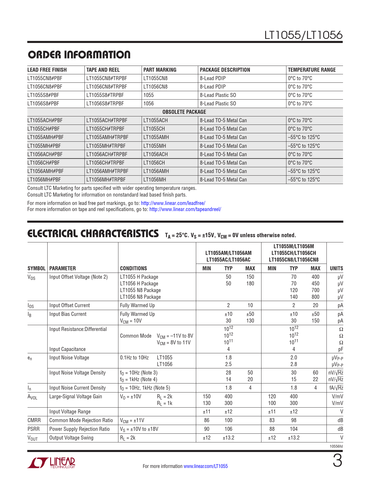 LT1055ACH#PBF LT1055ACH#TRPBF LT1055ACH 8-Lead TO-5 Metal Can 0°C to 70°C LT1055CH#PBF LT1055CH#TRPBF LT1055CH 8-Lead TO-5 Metal Can 0°C to 70°C LT1055AMH#PBF LT1055AMH#TRPBF LT1055AMH 8-Lead TO-5 Metal Can –55°C to 125°C LT1055MH#PBF LT1055MH#TRPBF LT1055MH 8-Lead TO-5 Metal Can –55°C to 125°C LT1056ACH#PBF LT1056ACH#TRPBF LT1056ACH 8-Lead TO-5 Metal Can 0°C to 70°C LT1056CH#PBF LT1056CH#TRPBF LT1056CH 8-Lead TO-5 Metal Can 0°C to 70°C LT1056AMH#PBF LT1056AMH#TRPBF LT1056AMH 8-Lead TO-5 Metal Can –55°C to 125°C LT1056MH#PBF LT1056MH#TRPBF LT1056MH 8-Lead TO-5 Metal Can –55°C to 125°C Consult LTC Marketing for parts specified with wider operating temperature ranges. Consult LTC Marketing for information on nonstandard lead based finish parts. For more information on lead free part markings, go to: http://www.linear.com/leadfree/ For more information on tape and reel specifications, go to: http://www.linear.com/tapeandreel/