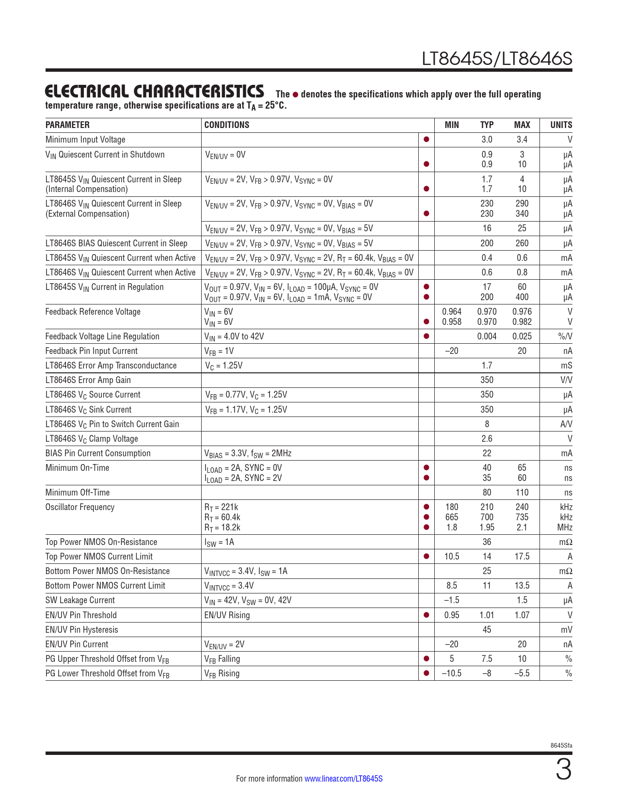 Minimum Input Voltage l 3.0 3.4 V VIN Quiescent Current in Shutdown VEN/UV = 0V 0.9 3 µA l 0.9 10 µA LT8645S VIN Quiescent Current in Sleep VEN/UV = 2V, VFB > 0.97V, VSYNC = 0V 1.7 4 µA (Internal Compensation) l 1.7 10 µA LT8646S VIN Quiescent Current in Sleep VEN/UV = 2V, VFB > 0.97V, VSYNC = 0V, VBIAS = 0V 230 290 µA (External Compensation) l 230 340 µA VEN/UV = 2V, VFB > 0.97V, VSYNC = 0V, VBIAS = 5V 16 25 µA LT8646S BIAS Quiescent Current in Sleep VEN/UV = 2V, VFB > 0.97V, VSYNC = 0V, VBIAS = 5V 200 260 µA LT8645S VIN Quiescent Current when Active VEN/UV = 2V, VFB > 0.97V, VSYNC = 2V, RT = 60.4k, VBIAS = 0V 0.4 0.6 mA LT8646S VIN Quiescent Current when Active VEN/UV = 2V, VFB > 0.97V, VSYNC = 2V, RT = 60.4k, VBIAS = 0V 0.6 0.8 mA LT8645S VIN Current in Regulation VOUT = 0.97V, VIN = 6V, ILOAD = 100µA, VSYNC = 0V l 17 60 µA VOUT = 0.97V, VIN = 6V, ILOAD = 1mA, VSYNC = 0V l 200 400 µA Feedback Reference Voltage VIN = 6V 0.964 0.970 0.976 V VIN = 6V l 0.958 0.970 0.982 V Feedback Voltage Line Regulation VIN = 4.0V to 42V l 0.004 0.025 %/V Feedback Pin Input Current VFB = 1V –20 20 nA LT8646S Error Amp Transconductance VC = 1.25V 1.7 mS LT8646S Error Amp Gain 350 V/V LT8646S VC Source Current VFB = 0.77V, VC = 1.25V 350 µA LT8646S VC Sink Current VFB = 1.17V, VC = 1.25V 350 µA LT8646S VC Pin to Switch Current Gain 8 A/V LT8646S VC Clamp Voltage 2.6 V BIAS Pin Current Consumption VBIAS = 3.3V, fSW = 2MHz 22 mA Minimum On-Time ILOAD = 2A, SYNC = 0V l 40 65 ns ILOAD = 2A, SYNC = 2V l 35 60 ns Minimum Off-Time 80 110 ns Oscillator Frequency RT = 221k l 180 210 240 kHz RT = 60.4k l 665 700 735 kHz RT = 18.2k l 1.8 1.95 2.1 MHz Top Power NMOS On-Resistance ISW = 1A 36 mΩ Top Power NMOS Current Limit l 10.5 14 17.5 A Bottom Power NMOS On-Resistance VINTVCC = 3.4V, ISW = 1A 25 mΩ Bottom Power NMOS Current Limit VINTVCC = 3.4V 8.5 11 13.5 A SW Leakage Current VIN = 42V, VSW = 0V, 42V –1.5 1.5 µA EN/UV Pin Threshold EN/UV Rising l 0.95 1.01 1.07 V EN/UV Pin Hysteresis 45 mV EN/UV Pin Current VEN/UV = 2V –20 20 nA PG Upper Threshold Offset from VFB VFB Falling l 5 7.5 10 % PG Lower Threshold Offset from VFB VFB Rising l –10.5 –8 –5.5 % 8645Sfa For more information www.linear.com/LT8645S 3