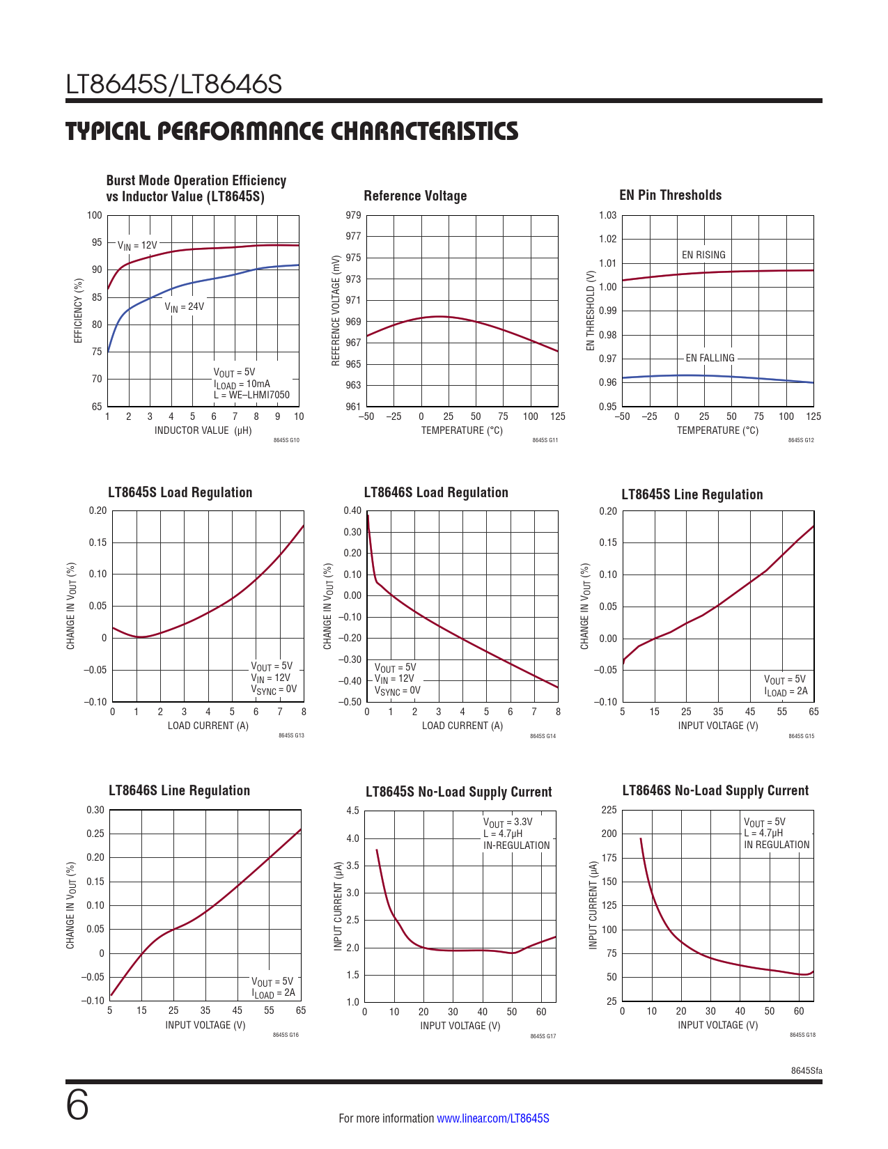 Burst Mode Operation Efficiency. vs Inductor Value (LT8645S). Reference Voltage. EN Pin Thresholds. LT8645S Load Regulation