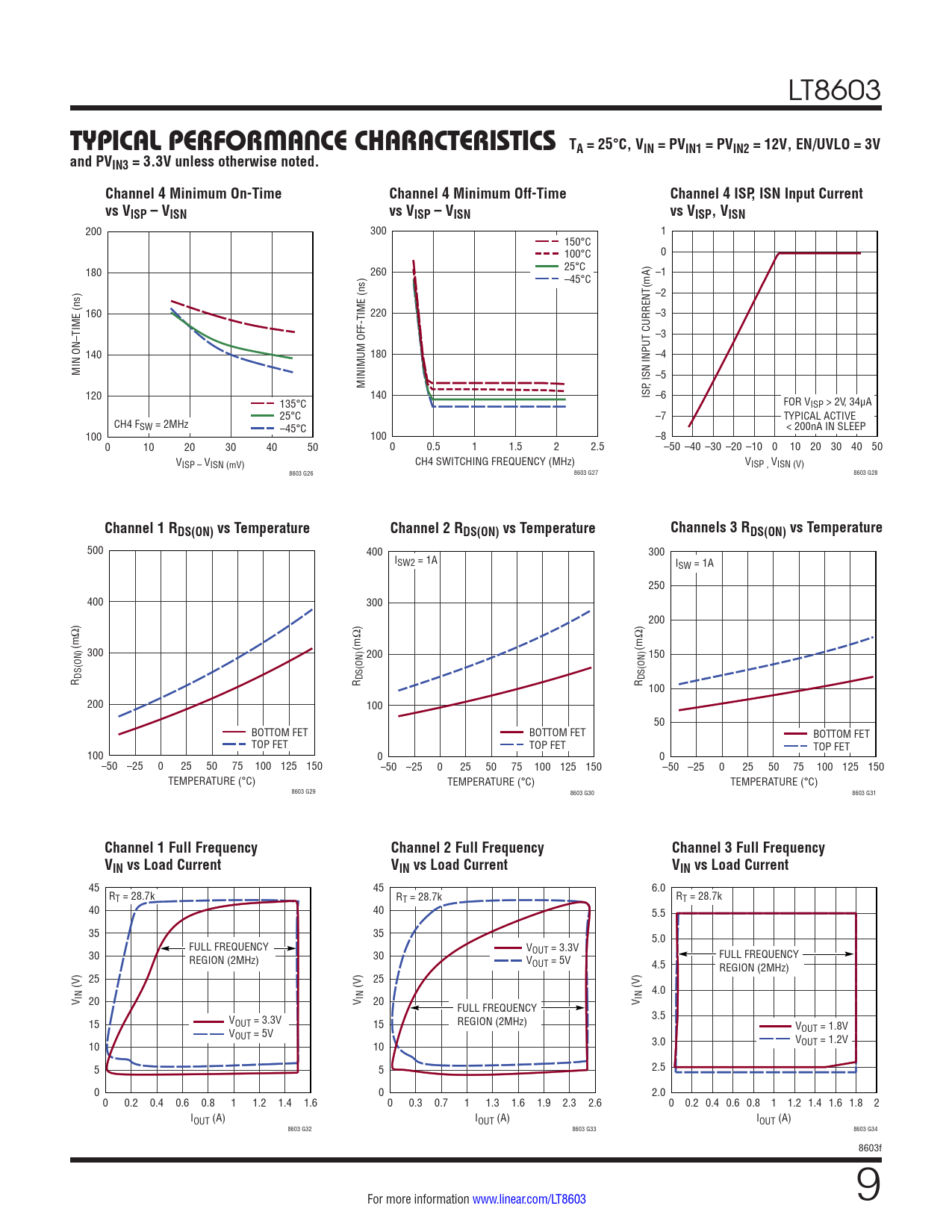 200 300 1 150°C 100°C 0 180 25°C 260 –1 –45°C –2 160 220 –3 –3 140 180 –4 MIN ON–TIME (ns) –5 MINIMUM OFF-TIME (ns) , ISN INPUT CURRENT(mA) 120 140 ISP –6 135°C FOR VISP > 2V, 34μA 25°C –7 TYPICAL ACTIVE CH4 FSW = 2MHz –45°C < 200nA IN SLEEP 100 100 –8 0 10 20 30 40 50 0 0.5 1 1.5 2 2.5 –50 –40 –30 –20 –10 0 10 20 30 40 50 VISP – VISN (mV) CH4 SWITCHING FREQUENCY (MHz) VISP , VISN (V) 8603 G26 8603 G27 8603 G28