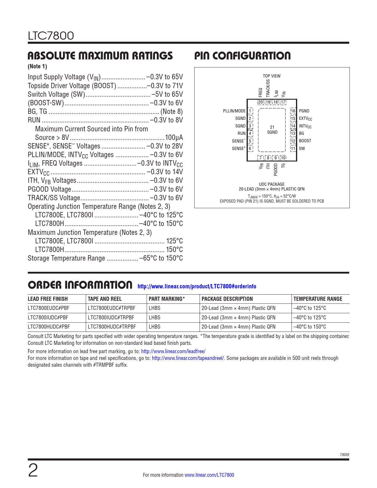 LTC7800 ABSOLUTE MAXIMUM RATINGSPIN CONFIGURATION(Note 1) Input Supply Voltage (VIN) ... –0.3V to 65V TOP VIEW Topside Driver Voltage (BOOST) ...–0.3V to 71V Switch Voltage (SW) ... –5V to 65V FREQ TRACK/SS I LIM V IN (BOOST-SW) .. –0.3V to 6V 20 19 18 17 BG, TG ... (Note 8) PLLIN/MODE 1 16 PGND RUN ... –0.3V to 8V SGND 2 15 EXTVCC Maximum Current Sourced into Pin from SGND 3 21 14 INTVCC SGND Source > 8V ..100μA RUN 4 13 BG SENSE– 5 12 BOOST SENSE+, SENSE– Voltages ... –0.3V to 28V SENSE+ 6 11 SW PLLIN/MODE, INTVCC Voltages ... –0.3V to 6V 7 8 9 10 ILIM, FREQ Voltages ..–0.3V to INTVCC TG EXTV V FB ITH CC .. –0.3V to 14V PGOOD ITH, VFB Voltages ... –0.3V to 6V UDC PACKAGE PGOOD Voltage .. –0.3V to 6V 20-LEAD (3mm × 4mm) PLASTIC QFN TRACK/SS Voltage ... –0.3V to 6V TJMAX = 150°C, θJA = 52°C/W EXPOSED PAD (PIN 21) IS SGND, MUST BE SOLDERED TO PCB Operating Junction Temperature Range (Notes 2, 3) LTC7800E, LTC7800I ... –40°C to 125°C LTC7800H .. –40°C to 150°C Maximum Junction Temperature (Notes 2, 3) LTC7800E, LTC7800I .. 125°C LTC7800H ... 150°C Storage Temperature Range .. –65°C to 150°C ORDER INFORMATION http://www.linear.com/product/LTC7800#orderinfoLEAD FREE FINISHTAPE AND REELPART MARKING*PACKAGE DESCRIPTIONTEMPERATURE RANGE LTC7800EUDC#PBF LTC7800EUDC#TRPBF LHBS 20-Lead (3mm × 4mm) Plastic QFN –40°C to 125°C LTC7800IUDC#PBF LTC7800IUDC#TRPBF LHBS 20-Lead (3mm × 4mm) Plastic QFN –40°C to 125°C LTC7800HUDC#PBF LTC7800HUDC#TRPBF LHBS 20-Lead (3mm × 4mm) Plastic QFN –40°C to 150°C Consult LTC Marketing for parts specified with wider operating temperature ranges. *The temperature grade is identified by a label on the shipping container. Consult LTC Marketing for information on non-standard lead based finish parts. For more information on lead free part marking, go to: http://www.linear.com/leadfree/ For more information on tape and reel specifications, go to: http://www.linear.com/tapeandreel/. Some packages are available in 500 unit reels through designated sales channels with #TRMPBF suffix. 7800f 2 For more information www.linear.com/LTC7800 Document Outline Features Applications Description Typical Application Absolute Maximum Ratings Pin Configuration Electrical Characteristics Typical Performance Characteristics Pin Functions FUNCTIONAL Diagram Operation Applications Information Typical Application Related Parts