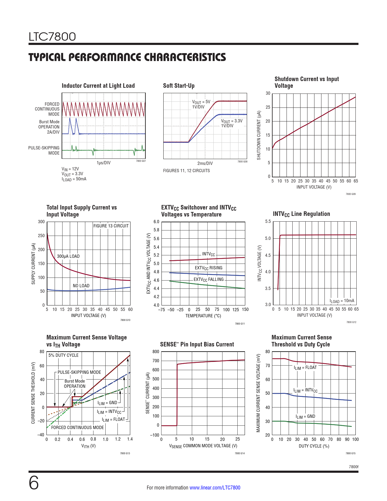 300 6.0 5.5 FIGURE 13 CIRCUIT 5.8 250 5.6 5.0 200 5.4 300µA LOAD VOLTAGE (V) 5.2 INTVCC 4.5 CC TAGE (V) 150 5.0 EXTV VOL Y CURRENT (µA) CC RISING 4.8 V CC 4.0 100 AND INTV 4.6 EXTV INT SUPPL CC FALLING NO LOAD CC 4.4 3.5 50 EXTV 4.2 ILOAD = 10mA 0 4.0 3.0 5 10 15 20 25 30 35 40 45 50 55 60 –75 –50 –25 0 25 50 75 100 125 150 0 5 10 15 20 25 30 35 40 45 50 55 60 65 INPUT VOLTAGE (V) TEMPERATURE (°C) INPUT VOLTAGE (V) 7800 G10 7800 G11 7800 G12