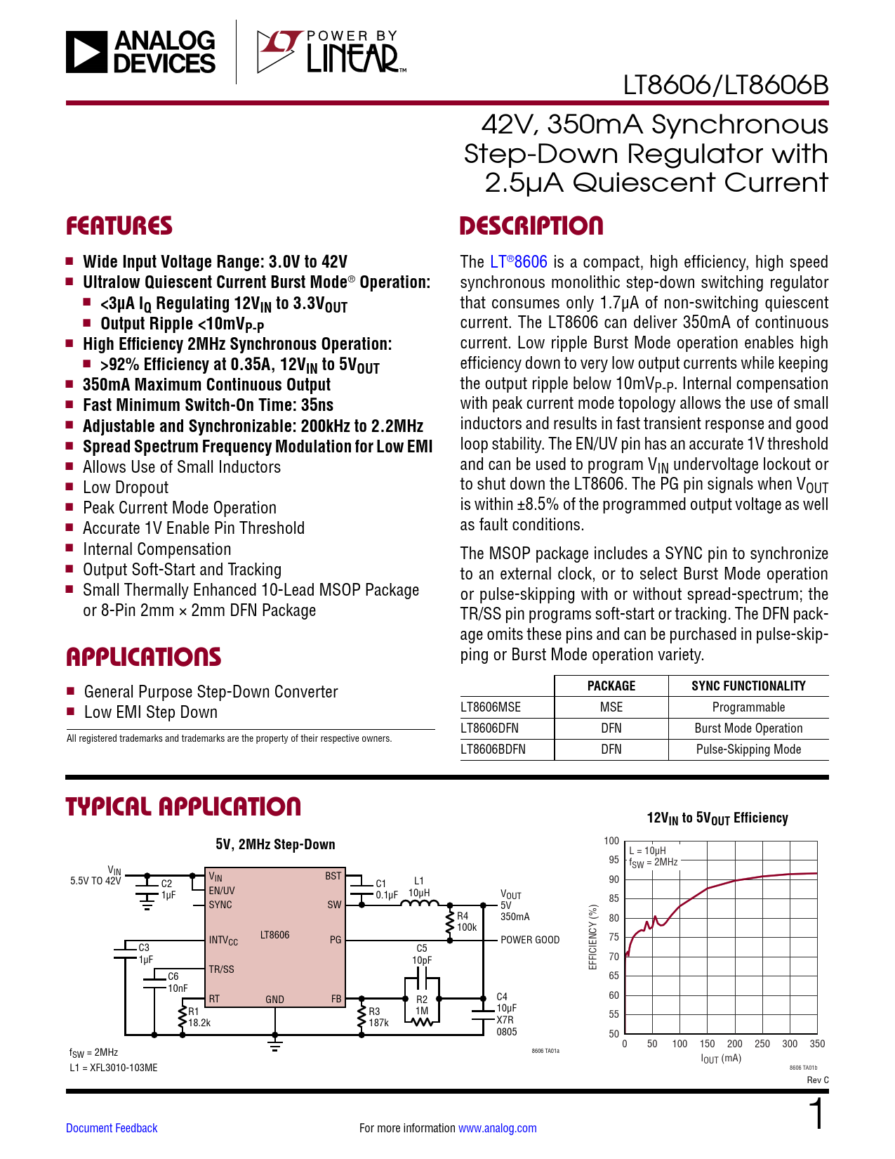 LT8606/LT8606B 42V, 350mA Synchronous Step-Down Regulator with 2.5µA Quiescent Current FEATURESDESCRIPTION n Wide Input Voltage Range: 3.0V to 42V The LT®8606 is a compact, high efficiency, high speed n Ultralow Quiescent Current Burst Mode ® Operation: synchronous monolithic step-down switching regulator n <3µA IQ Regulating 12VIN to 3.3VOUT that consumes only 1.7µA of non-switching quiescent n Output Ripple <10mV current. The LT8606 can deliver 350mA of continuous P-P n High Efficiency 2MHz Synchronous Operation: current. Low ripple Burst Mode operation enables high n >92% Efficiency at 0.35A, 12V efficiency down to very low output currents while keeping IN to 5VOUT n 350mA Maximum Continuous Output the output ripple below 10mVP-P. Internal compensation n Fast Minimum Switch-On Time: 35ns with peak current mode topology allows the use of small n Adjustable and Synchronizable: 200kHz to 2.2MHz inductors and results in fast transient response and good n Spread Spectrum Frequency Modulation for Low EMI loop stability. The EN/UV pin has an accurate 1V threshold n Allows Use of Small Inductors and can be used to program VIN undervoltage lockout or n Low Dropout to shut down the LT8606. The PG pin signals when VOUT n Peak Current Mode Operation is within ±8.5% of the programmed output voltage as well n Accurate 1V Enable Pin Threshold as fault conditions. n Internal Compensation The MSOP package includes a SYNC pin to synchronize n Output Soft-Start and Tracking to an external clock, or to select Burst Mode operation n Small Thermally Enhanced 10-Lead MSOP Package or pulse-skipping with or without spread-spectrum; the or 8-Pin 2mm × 2mm DFN Package TR/SS pin programs soft-start or tracking. The DFN pack- age omits these pins and can be purchased in pulse-skip- ping or Burst Mode operation variety. APPLICATIONSPACKAGESYNC FUNCTIONALITY n General Purpose Step-Down Converter LT8606MSE MSE Programmable n Low EMI Step Down LT8606DFN DFN Burst Mode Operation All registered trademarks and trademarks are the property of their respective owners. LT8606BDFN DFN Pulse-Skipping Mode TYPICAL APPLICATION12VIN to 5VOUT Efficiency5V, 2MHz Step-Down 100 L = 10µH 95 f V SW = 2MHz IN VIN BST 5.5V TO 42V C2 C1 L1 90 EN/UV 1µF 0.1µF 10µH VOUT 85 SYNC SW 5V R4 350mA 80 100k INTV LT8606 CC PG POWER GOOD 75 C3 C5 1µF 10pF 70 TR/SS EFFICIENCY (%) C6 65 10nF RT GND FB R2 C4 60 R1 R3 1M 10µF 55 18.2k 187k X7R 0805 50 0 50 100 150 200 250 300 350 8606 TA01a fSW = 2MHz IOUT (mA) L1 = XFL3010-103ME 8606 TA01b Rev C Document Feedback For more information www.analog.com 1 Document Outline FEATURES DESCRIPTION APPLICATIONS TYPICAL APPLICATION ABSOLUTE MAXIMUM RATINGS PIN CONFIGURATION ORDER INFORMATION ELECTRICAL CHARACTERISTICS TYPICAL PERFORMANCE CHARACTERISTICS PIN FUNCTIONS BLOCK DIAGRAM OPERATION APPLICATIONS INFORMATION TYPICAL APPLICATIONS PACKAGE DESCRIPTION REVISION HISTORY TYPICAL APPLICATION RELATED PARTS