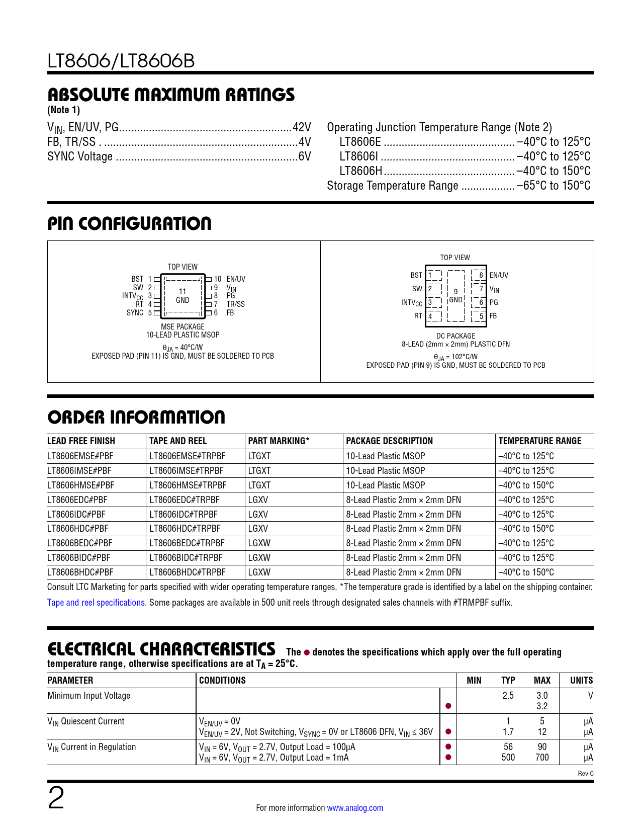 LT8606EMSE#PBF LT8606EMSE#TRPBF LTGXT 10-Lead Plastic MSOP –40°C to 125°C LT8606IMSE#PBF LT8606IMSE#TRPBF LTGXT 10-Lead Plastic MSOP –40°C to 125°C LT8606HMSE#PBF LT8606HMSE#TRPBF LTGXT 10-Lead Plastic MSOP –40°C to 150°C LT8606EDC#PBF LT8606EDC#TRPBF LGXV 8-Lead Plastic 2mm × 2mm DFN –40°C to 125°C LT8606IDC#PBF LT8606IDC#TRPBF LGXV 8-Lead Plastic 2mm × 2mm DFN –40°C to 125°C LT8606HDC#PBF LT8606HDC#TRPBF LGXV 8-Lead Plastic 2mm × 2mm DFN –40°C to 150°C LT8606BEDC#PBF LT8606BEDC#TRPBF LGXW 8-Lead Plastic 2mm × 2mm DFN –40°C to 125°C LT8606BIDC#PBF LT8606BIDC#TRPBF LGXW 8-Lead Plastic 2mm × 2mm DFN –40°C to 125°C LT8606BHDC#PBF LT8606BHDC#TRPBF LGXW 8-Lead Plastic 2mm × 2mm DFN –40°C to 150°C Consult LTC Marketing for parts specified with wider operating temperature ranges. *The temperature grade is identified by a label on the shipping container. Tape and reel specifications. Some packages are available in 500 unit reels through designated sales channels with #TRMPBF suffix.