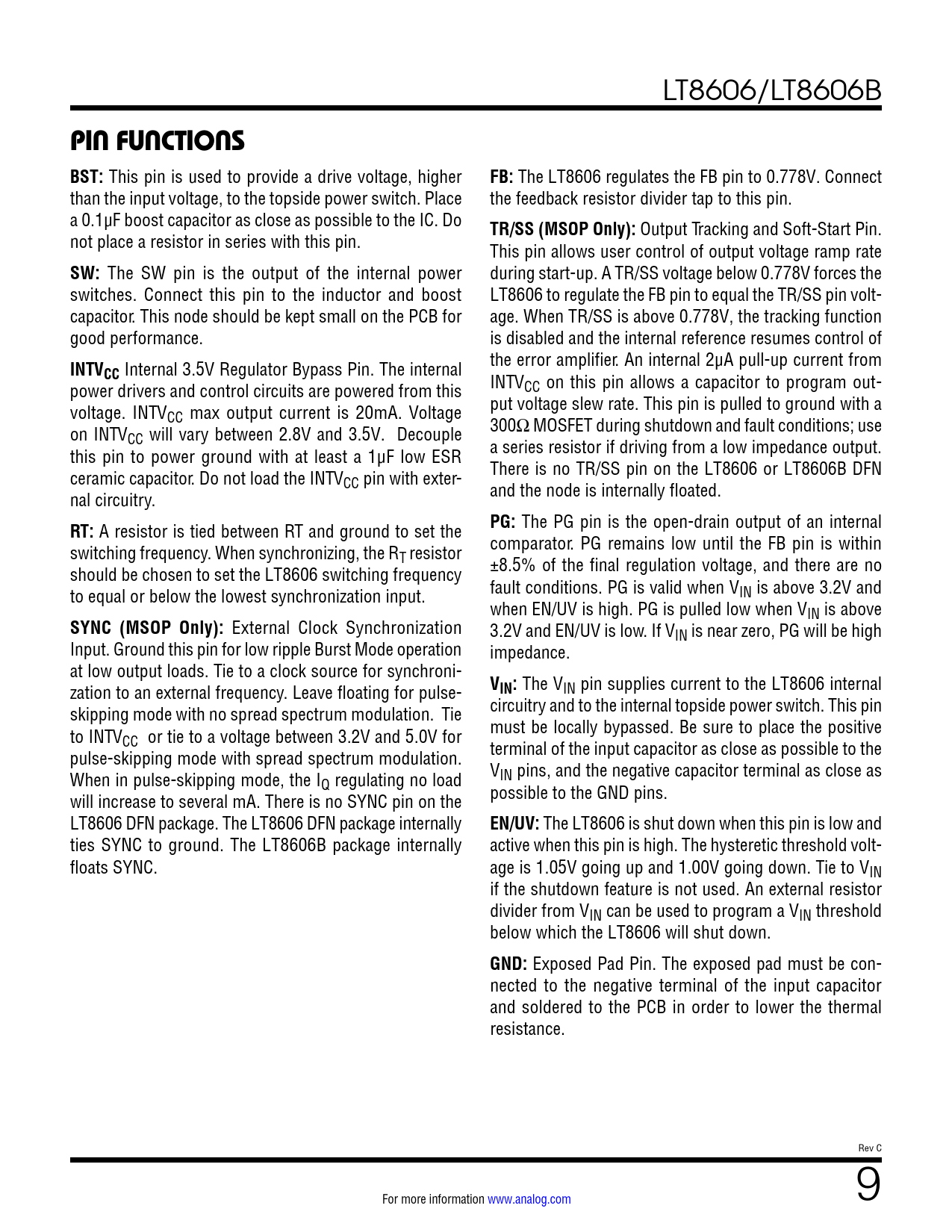 PIN FUNCTIONS BST:. FB:. TR/SS (MSOP Only):. SW:. INTV. RT:. PG:. SYNC (MSOP Only):. VIN:. EN/UV:. GND: