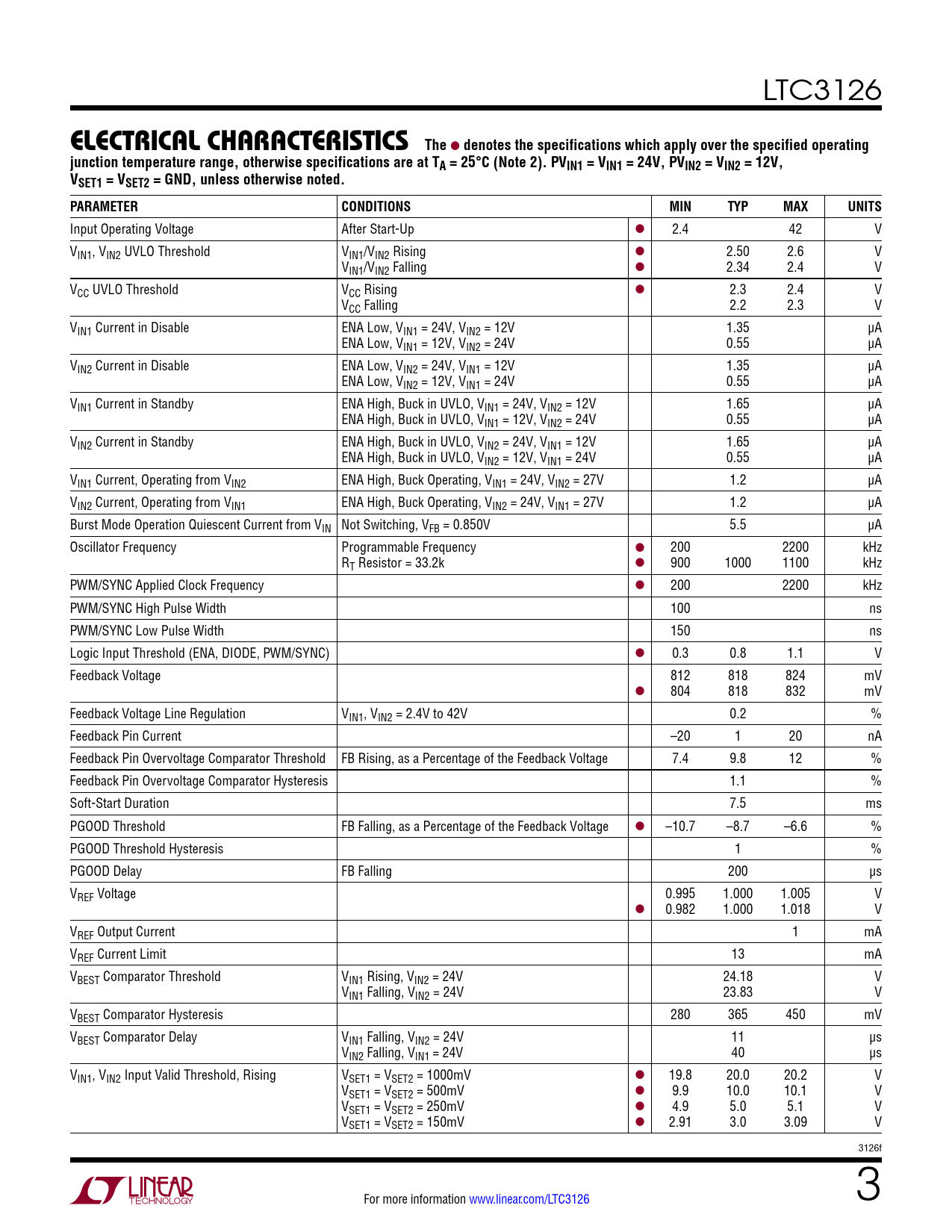 Input Operating Voltage After Start-Up l 2.4 42 V VIN1, VIN2 UVLO Threshold VIN1/VIN2 Rising l 2.50 2.6 V VIN1/VIN2 Falling l 2.34 2.4 V VCC UVLO Threshold VCC Rising l 2.3 2.4 V VCC Falling 2.2 2.3 V VIN1 Current in Disable ENA Low, VIN1 = 24V, VIN2 = 12V 1.35 µA ENA Low, VIN1 = 12V, VIN2 = 24V 0.55 µA VIN2 Current in Disable ENA Low, VIN2 = 24V, VIN1 = 12V 1.35 µA ENA Low, VIN2 = 12V, VIN1 = 24V 0.55 µA VIN1 Current in Standby ENA High, Buck in UVLO, VIN1 = 24V, VIN2 = 12V 1.65 µA ENA High, Buck in UVLO, VIN1 = 12V, VIN2 = 24V 0.55 µA VIN2 Current in Standby ENA High, Buck in UVLO, VIN2 = 24V, VIN1 = 12V 1.65 µA ENA High, Buck in UVLO, VIN2 = 12V, VIN1 = 24V 0.55 µA VIN1 Current, Operating from VIN2 ENA High, Buck Operating, VIN1 = 24V, VIN2 = 27V 1.2 µA VIN2 Current, Operating from VIN1 ENA High, Buck Operating, VIN2 = 24V, VIN1 = 27V 1.2 µA Burst Mode Operation Quiescent Current from VIN Not Switching, VFB = 0.850V 5.5 µA Oscillator Frequency Programmable Frequency l 200 2200 kHz RT Resistor = 33.2k l 900 1000 1100 kHz PWM/SYNC Applied Clock Frequency l 200 2200 kHz PWM/SYNC High Pulse Width 100 ns PWM/SYNC Low Pulse Width 150 ns Logic Input Threshold (ENA, DIODE, PWM/SYNC) l 0.3 0.8 1.1 V Feedback Voltage 812 818 824 mV l 804 818 832 mV Feedback Voltage Line Regulation VIN1, VIN2 = 2.4V to 42V 0.2 % Feedback Pin Current –20 1 20 nA Feedback Pin Overvoltage Comparator Threshold FB Rising, as a Percentage of the Feedback Voltage 7.4 9.8 12 % Feedback Pin Overvoltage Comparator Hysteresis 1.1 % Soft-Start Duration 7.5 ms PGOOD Threshold FB Falling, as a Percentage of the Feedback Voltage l –10.7 –8.7 –6.6 % PGOOD Threshold Hysteresis 1 % PGOOD Delay FB Falling 200 µs VREF Voltage 0.995 1.000 1.005 V l 0.982 1.000 1.018 V VREF Output Current 1 mA VREF Current Limit 13 mA VBEST Comparator Threshold VIN1 Rising, VIN2 = 24V 24.18 V VIN1 Falling, VIN2 = 24V 23.83 V VBEST Comparator Hysteresis 280 365 450 mV VBEST Comparator Delay VIN1 Falling, VIN2 = 24V 11 µs VIN2 Falling, VIN1 = 24V 40 µs VIN1, VIN2 Input Valid Threshold, Rising VSET1 = VSET2 = 1000mV l 19.8 20.0 20.2 V VSET1 = VSET2 = 500mV l 9.9 10.0 10.1 V VSET1 = VSET2 = 250mV l 4.9 5.0 5.1 V VSET1 = VSET2 = 150mV l 2.91 3.0 3.09 V 3126f For more information www.linear.com/LTC3126 3 Document Outline Features Applications Description Typical Application Absolute Maximum Ratings Pin Configuration Order Information Electrical Characteristics Typical Performance Characteristics Pin Functions Block Diagram Quick Reference Operation Applications Information Typical Applications Package Description Typical Application Related Parts