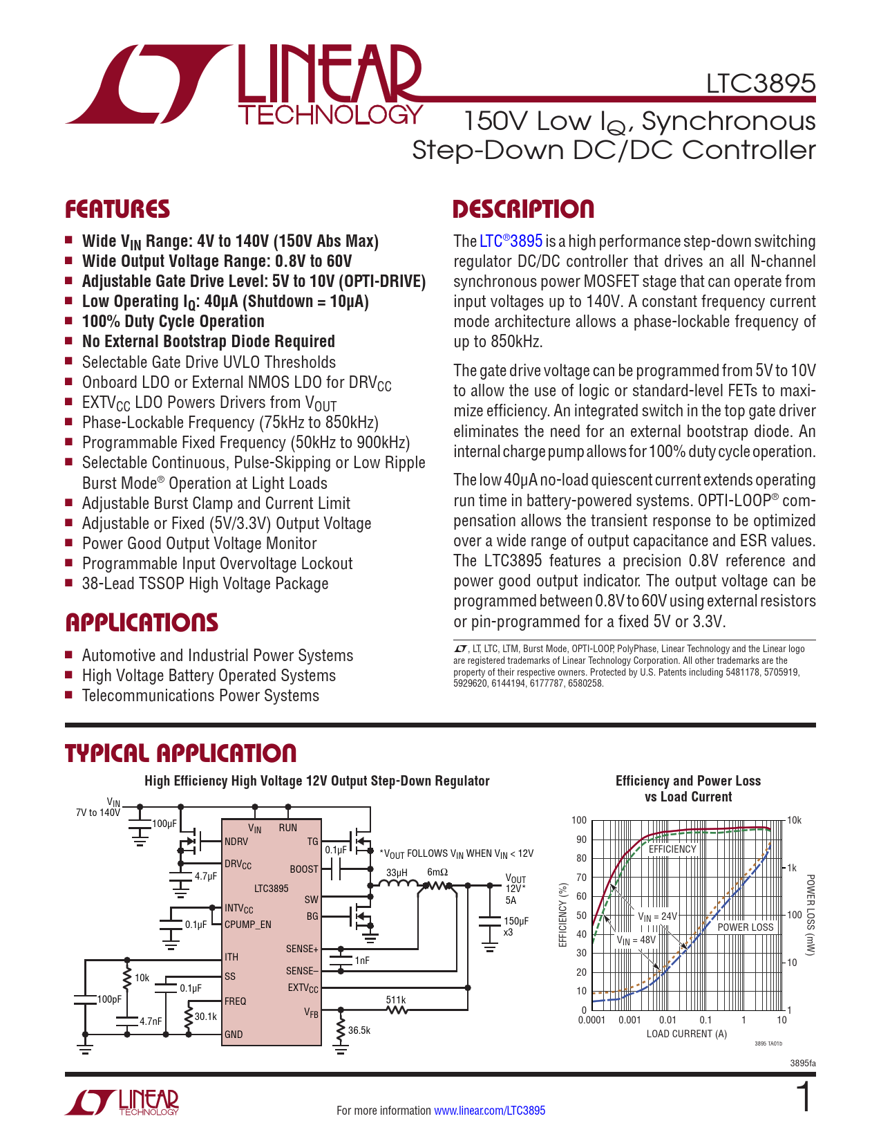 LTC3895 150V Low IQ, Synchronous Step-Down DC/DC Controller FeaTuresDescripTion n Wide VIN Range: 4V to 140V (150V Abs Max) The LTC®3895 is a high performance step-down switching n Wide Output Voltage Range: 0.8V to 60V regulator DC/DC controller that drives an all N-channel n Adjustable Gate Drive Level: 5V to 10V (OPTI-DRIVE) synchronous power MOSFET stage that can operate from n Low Operating IQ: 40μA (Shutdown = 10μA) input voltages up to 140V. A constant frequency current n 100% Duty Cycle Operation mode architecture allows a phase-lockable frequency of n No External Bootstrap Diode Required up to 850kHz. n Selectable Gate Drive UVLO Thresholds The gate drive voltage can be programmed from 5V to 10V n Onboard LDO or External NMOS LDO for DRVCC to allow the use of logic or standard-level FETs to maxi- n EXTVCC LDO Powers Drivers from VOUT mize efficiency. An integrated switch in the top gate driver n Phase-Lockable Frequency (75kHz to 850kHz) eliminates the need for an external bootstrap diode. An n Programmable Fixed Frequency (50kHz to 900kHz) internal charge pump allows for 100% duty cycle operation. n Selectable Continuous, Pulse-Skipping or Low Ripple Burst Mode® Operation at Light Loads The low 40μA no-load quiescent current extends operating n Adjustable Burst Clamp and Current Limit run time in battery-powered systems. OPTI-LOOP® com- n Adjustable or Fixed (5V/3.3V) Output Voltage pensation allows the transient response to be optimized n Power Good Output Voltage Monitor over a wide range of output capacitance and ESR values. n Programmable Input Overvoltage Lockout The LTC3895 features a precision 0.8V reference and n 38-Lead TSSOP High Voltage Package power good output indicator. The output voltage can be programmed between 0.8V to 60V using external resistors applicaTions or pin-programmed for a fixed 5V or 3.3V. L, LT, LTC, LTM, Burst Mode, OPTI-LOOP, PolyPhase, Linear Technology and the Linear logo n Automotive and Industrial Power Systems are registered trademarks of Linear Technology Corporation. All other trademarks are the n High Voltage Battery Operated Systems property of their respective owners. Protected by U.S. Patents including 5481178, 5705919, 5929620, 6144194, 6177787, 6580258. n Telecommunications Power Systems Typical applicaTionHigh Efficiency High Voltage 12V Output Step-Down RegulatorEfficiency and Power Loss V vs Load Current IN 7V to 140V 100µF 100 10k VIN RUN NDRV TG 90 0.1µF *V EFFICIENCY OUT FOLLOWS VIN WHEN VIN < 12V DRV 80 CC BOOST 1k 4.7µF 33µH 6mΩ POWER LOSS (mW) VOUT 70 LTC3895 12V* SW 5A 60 INTVCC BG 150µF 50 V 100 0.1µF CPUMP_EN IN = 24V x3 POWER LOSS 40 VIN = 48V SENSE+ EFFICIENCY (%) ITH 30 1nF 10 SENSE– 10k SS 20 0.1µF EXTVCC 10 100pF FREQ 511k VFB 0 1 4.7nF 30.1k 0.0001 0.001 0.01 0.1 1 10 36.5k GND LOAD CURRENT (A) 3895 TA01b 3895fa For more information www.linear.com/LTC3895 1 Document Outline Features Applications Typical Application Description Absolute Maximum Ratings Order Information Pin Configuration Electrical Characteristics Typical Performance Characteristics Pin Functions Functional Diagram Operation Applications Information Typical Applications Package Description Revision History Typical Application Related Parts