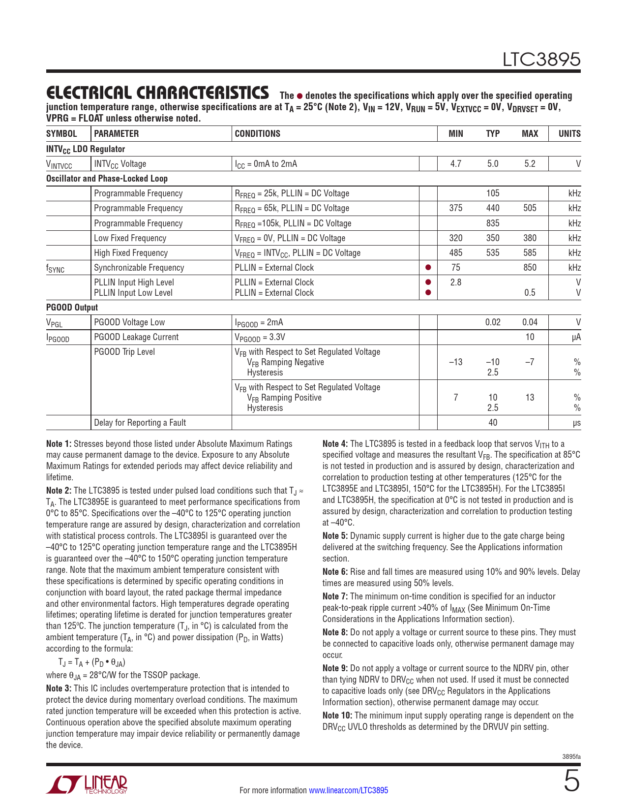 LTC3895 elecTrical characTerisTicsThe l denotes the specifications which apply over the specified operatingjunction temperature range, otherwise specifications are at TA = 25°C (Note 2), VIN = 12V, VRUN = 5V, VEXTVCC = 0V, VDRVSET = 0V,VPRG = FLOAT unless otherwise noted. SYMBOLPARAMETERCONDITIONSMINTYPMAXUNITSINTVCC LDO Regulator VINTVCC INTVCC Voltage ICC = 0mA to 2mA 4.7 5.0 5.2 V Oscillator and Phase-Locked Loop Programmable Frequency RFREQ = 25k, PLLIN = DC Voltage 105 kHz Programmable Frequency RFREQ = 65k, PLLIN = DC Voltage 375 440 505 kHz Programmable Frequency RFREQ =105k, PLLIN = DC Voltage 835 kHz Low Fixed Frequency VFREQ = 0V, PLLIN = DC Voltage 320 350 380 kHz High Fixed Frequency VFREQ = INTVCC, PLLIN = DC Voltage 485 535 585 kHz fSYNC Synchronizable Frequency PLLIN = External Clock l 75 850 kHz PLLIN Input High Level PLLIN = External Clock l 2.8 V PLLIN Input Low Level PLLIN = External Clock l 0.5 V PGOOD Output VPGL PGOOD Voltage Low IPGOOD = 2mA 0.02 0.04 V IPGOOD PGOOD Leakage Current VPGOOD = 3.3V 10 µA PGOOD Trip Level VFB with Respect to Set Regulated Voltage VFB Ramping Negative –13 –10 –7 % Hysteresis 2.5 % VFB with Respect to Set Regulated Voltage VFB Ramping Positive 7 10 13 % Hysteresis 2.5 % Delay for Reporting a Fault 40 µs Note 1: Stresses beyond those listed under Absolute Maximum Ratings Note 4: The LTC3895 is tested in a feedback loop that servos VITH to a may cause permanent damage to the device. Exposure to any Absolute specified voltage and measures the resultant VFB. The specification at 85°C Maximum Ratings for extended periods may affect device reliability and is not tested in production and is assured by design, characterization and lifetime. correlation to production testing at other temperatures (125°C for the Note 2: The LTC3895 is tested under pulsed load conditions such that T LTC3895E and LTC3895I, 150°C for the LTC3895H). For the LTC3895I J ≈ T and LTC3895H, the specification at 0°C is not tested in production and is A. The LTC3895E is guaranteed to meet performance specifications from 0°C to 85°C. Specifications over the –40°C to 125°C operating junction assured by design, characterization and correlation to production testing temperature range are assured by design, characterization and correlation at –40°C. with statistical process controls. The LTC3895I is guaranteed over the Note 5: Dynamic supply current is higher due to the gate charge being –40°C to 125°C operating junction temperature range and the LTC3895H delivered at the switching frequency. See the Applications information is guaranteed over the –40°C to 150°C operating junction temperature section. range. Note that the maximum ambient temperature consistent with Note 6: Rise and fall times are measured using 10% and 90% levels. Delay these specifications is determined by specific operating conditions in times are measured using 50% levels. conjunction with board layout, the rated package thermal impedance Note 7: The minimum on-time condition is specified for an inductor and other environmental factors. High temperatures degrade operating peak-to-peak ripple current >40% of I lifetimes; operating lifetime is derated for junction temperatures greater MAX (See Minimum On-Time Considerations in the Applications Information section). than 125ºC. The junction temperature (TJ, in °C) is calculated from the ambient temperature (T Note 8: Do not apply a voltage or current source to these pins. They must A, in °C) and power dissipation (PD, in Watts) according to the formula: be connected to capacitive loads only, otherwise permanent damage may occur. TJ = TA + (PD • θJA) Note 9: Do not apply a voltage or current source to the NDRV pin, other where θJA = 28°C/W for the TSSOP package. than tying NDRV to DRVCC when not used. If used it must be connected Note 3: This IC includes overtemperature protection that is intended to to capacitive loads only (see DRVCC Regulators in the Applications protect the device during momentary overload conditions. The maximum Information section), otherwise permanent damage may occur. rated junction temperature will be exceeded when this protection is active. Note 10: The minimum input supply operating range is dependent on the Continuous operation above the specified absolute maximum operating DRV junction temperature may impair device reliability or permanently damage CC UVLO thresholds as determined by the DRVUV pin setting. the device. 3895fa For more information www.linear.com/LTC3895 5 Document Outline Features Applications Typical Application Description Absolute Maximum Ratings Order Information Pin Configuration Electrical Characteristics Typical Performance Characteristics Pin Functions Functional Diagram Operation Applications Information Typical Applications Package Description Revision History Typical Application Related Parts