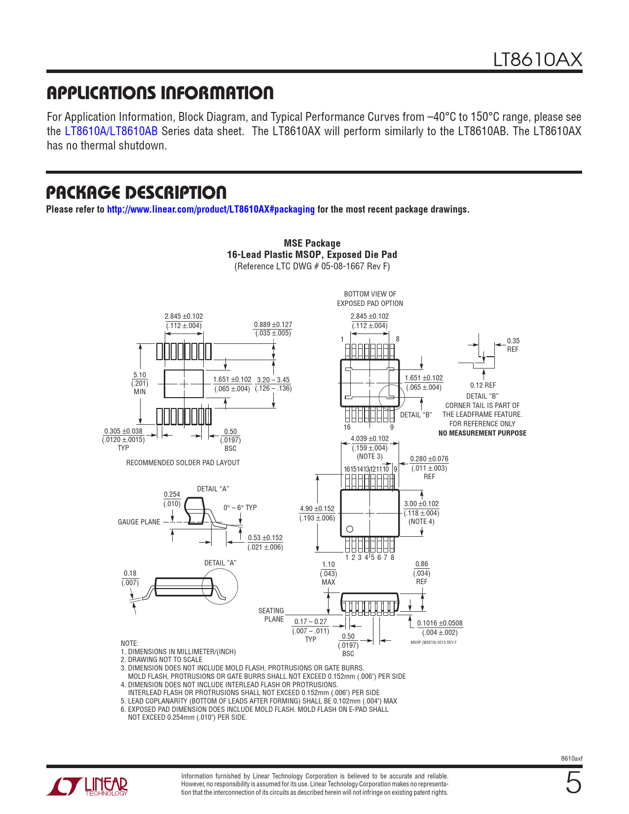 LT8610AX APPLICATIONS INFORMATION For Application Information, Block Diagram, and Typical Performance Curves from –40°C to 150°C range, please see the LT8610A/LT8610AB Series data sheet. The LT8610AX will perform similarly to the LT8610AB. The LT8610AX has no thermal shutdown. PACKAGE DESCRIPTIONPlease refer to http://www.linear.com/product/LT8610AX#packaging for the most recent package drawings.MSE Package16-Lead Plastic MSOP, Exposed Die Pad (Reference LTC DWG # 05-08-1667 Rev F) BOTTOM VIEW OF EXPOSED PAD OPTION 2.845 ±0.102 2.845 ±0.102 (.112 ±.004) 0.889 ±0.127 (.112 ±.004) (.035 ±.005) 1 8 0.35 REF 5.10 1.651 ±0.102 (.201) 1.651 ±0.102 3.20 – 3.45 0.12 REF MIN (.065 ±.004) (.126 – .136) (.065 ±.004) DETAIL “B” CORNER TAIL IS PART OF DETAIL “B” THE LEADFRAME FEATURE. 16 9 FOR REFERENCE ONLY 0.305 ±0.038 0.50 NO MEASUREMENT PURPOSE (.0120 ±.0015) (.0197) 4.039 ±0.102 TYP BSC (.159 ±.004) (NOTE 3) RECOMMENDED SOLDER PAD LAYOUT 0.280 ±0.076 16151413121110 9 (.011 ±.003) REF DETAIL “A” 0.254 (.010) 0° – 6° TYP 3.00 ±0.102 4.90 ±0.152 (.118 ±.004) GAUGE PLANE (.193 ±.006) (NOTE 4) 0.53 ±0.152 (.021 ±.006) 1 2 3 4 5 6 7 8 DETAIL “A” 1.10 0.86 0.18 (.043) (.034) (.007) MAX REF SEATING PLANE 0.17 – 0.27 0.1016 ±0.0508 (.007 – .011) (.004 ±.002) TYP 0.50 MSOP (MSE16) 0213 REV F NOTE: (.0197) 1. DIMENSIONS IN MILLIMETER/(INCH) BSC 2. DRAWING NOT TO SCALE 3. DIMENSION DOES NOT INCLUDE MOLD FLASH, PROTRUSIONS OR GATE BURRS. MOLD FLASH, PROTRUSIONS OR GATE BURRS SHALL NOT EXCEED 0.152mm (.006") PER SIDE 4. DIMENSION DOES NOT INCLUDE INTERLEAD FLASH OR PROTRUSIONS. INTERLEAD FLASH OR PROTRUSIONS SHALL NOT EXCEED 0.152mm (.006") PER SIDE 5. LEAD COPLANARITY (BOTTOM OF LEADS AFTER FORMING) SHALL BE 0.102mm (.004") MAX 6. EXPOSED PAD DIMENSION DOES INCLUDE MOLD FLASH. MOLD FLASH ON E-PAD SHALL NOT EXCEED 0.254mm (.010") PER SIDE. 8610axf Information furnished by Linear Technology Corporation is believed to be accurate and reliable. However, no responsibility is assumed for its use. Linear Technology Corporation makes no representa- tion that the inter For mo connection re of in its fo cir rma cuits tion www.l as described inear. herein com will /L not T8610 infringe AX on existing patent rights. 5 Document Outline Features Applications Typical Application Description Absolute Maximum Ratings Order Information Electrical Characteristics Pin Configuration Typical Performance Characteristics Pin Functions Related Parts