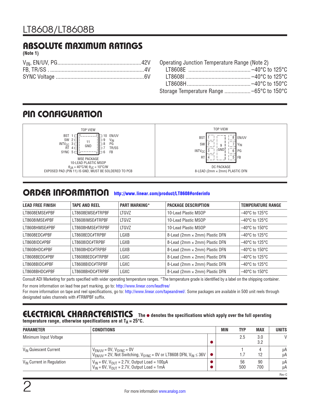 Minimum Input Voltage 2.5 3.0 V l 3.2 VIN Quiescent Current VEN/UV = 0V, VSYNC = 0V 1 4 µA VEN/UV = 2V, Not Switching, VSYNC = 0V or LT8608 DFN, VIN ≤ 36V l 1.7 12 µA VIN Current in Regulation VIN = 6V, VOUT = 2.7V, Output Load = 100µA l 56 90 µA VIN = 6V, VOUT = 2.7V, Output Load = 1mA l 500 700 µA Rev C 2 For more information www.analog.com Document Outline Features Applications Typical Application Description Absolute Maximum Ratings Pin Configuration Order Information Electrical Characteristics Pin Functions Block Diagram Operation Applications Information Typical Applications Package Description Revision History Typical Application Related Parts