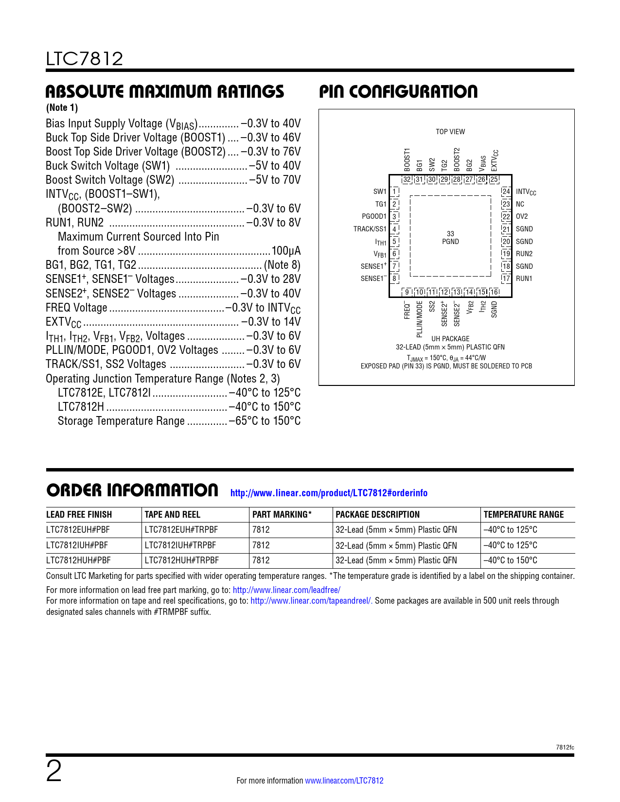 ABSOLUTE MAXIMUM RATINGS PIN CONFIGURATION (Note 1) ORDER INFORMATION http://www.linear.com/product/LTC7812#orderinfo