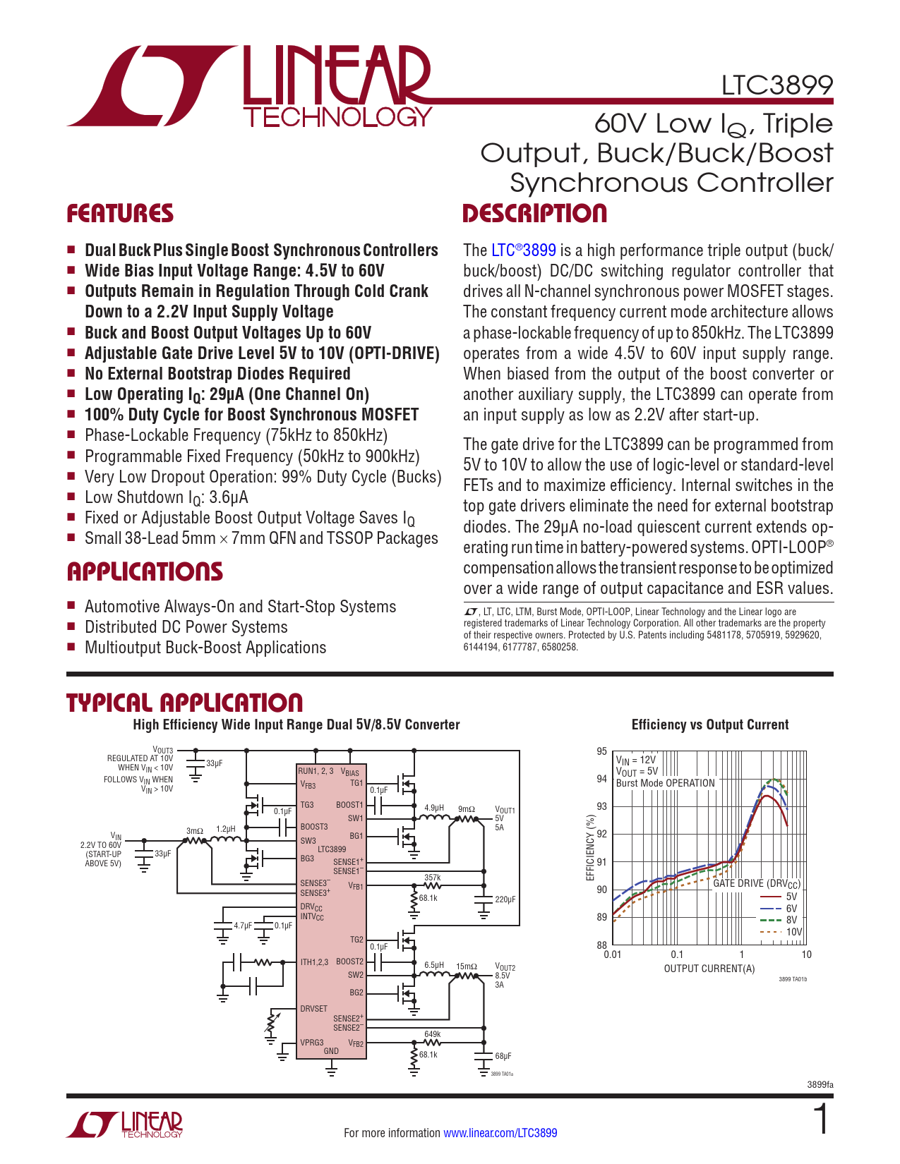 LTC3899 60V Low IQ, Triple Output, Buck/Buck/Boost Synchronous Controller FEATURESDESCRIPTION n Dual Buck Plus Single Boost Synchronous Controllers The LTC®3899 is a high performance triple output (buck/ n Wide Bias Input Voltage Range: 4.5V to 60V buck/boost) DC/DC switching regulator controller that n Outputs Remain in Regulation Through Cold Crank drives all N-channel synchronous power MOSFET stages. Down to a 2.2V Input Supply Voltage The constant frequency current mode architecture allows n Buck and Boost Output Voltages Up to 60V a phase-lockable frequency of up to 850kHz. The LTC3899 n Adjustable Gate Drive Level 5V to 10V (OPTI-DRIVE) operates from a wide 4.5V to 60V input supply range. n No External Bootstrap Diodes Required When biased from the output of the boost converter or n Low Operating IQ: 29μA (One Channel On) another auxiliary supply, the LTC3899 can operate from n 100% Duty Cycle for Boost Synchronous MOSFET an input supply as low as 2.2V after start-up. n Phase-Lockable Frequency (75kHz to 850kHz) The gate drive for the LTC3899 can be programmed from n Programmable Fixed Frequency (50kHz to 900kHz) 5V to 10V to allow the use of logic-level or standard-level n Very Low Dropout Operation: 99% Duty Cycle (Bucks) FETs and to maximize efficiency. Internal switches in the n Low Shutdown IQ: 3.6μA top gate drivers eliminate the need for external bootstrap n Fixed or Adjustable Boost Output Voltage Saves IQ diodes. The 29μA no-load quiescent current extends op- n Small 38-Lead 5mm × 7mm QFN and TSSOP Packages erating run time in battery-powered systems. OPTI-LOOP® compensation allows the transient response to be optimized APPLICATIONS over a wide range of output capacitance and ESR values. n Automotive Always-On and Start-Stop Systems L, LT, LTC, LTM, Burst Mode, OPTI-LOOP, Linear Technology and the Linear logo are n Distributed DC Power Systems registered trademarks of Linear Technology Corporation. All other trademarks are the property of their respective owners. Protected by U.S. Patents including 5481178, 5705919, 5929620, n Multioutput Buck-Boost Applications 6144194, 6177787, 6580258. TYPICAL APPLICATIONHigh Efficiency Wide Input Range Dual 5V/8.5V ConverterEfficiency vs Output Current VOUT3 95 REGULATED AT 10V 33µF VIN = 12V WHEN VIN < 10V RUN1, 2, 3 VBIAS VOUT = 5V FOLLOWS VIN WHEN 94 V TG1 FB3 Burst Mode OPERATION VIN > 10V 0.1µF TG3 BOOST1 0.1µF 4.9µH 9mΩ V 93 OUT1 SW1 5V 3mΩ 1.2µH BOOST3 5A VIN BG1 92 SW3 2.2V TO 60V LTC3899 (START-UP 33µF BG3 ABOVE 5V) SENSE1+ 91 SENSE1– 357k EFFICIENCY (%) SENSE3– VFB1 GATE DRIVE (DRVCC) SENSE3+ 90 68.1k 220µF 5V DRVCC 6V INTVCC 89 8V 4.7µF 0.1µF 10V TG2 0.1µF 880.01 0.1 1 10 ITH1,2,3 BOOST2 6.5µH 15mΩ VOUT2 OUTPUT CURRENT(A) SW2 8.5V 3899 TA01b 3A BG2 DRVSET SENSE2+ SENSE2– 649k VPRG3 VFB2 GND 68.1k 68µF 3899 TA01a 3899fa For more information www.linear.com/LTC3899 1 Document Outline Features Applications Description Typical Application Absolute Maximum Ratings Pin Configuration Order Information Electrical Characteristics Typical Performance Characteristics Pin Functions Functional Diagrams Operation Typical Applications Package Description Typical Application Related Parts