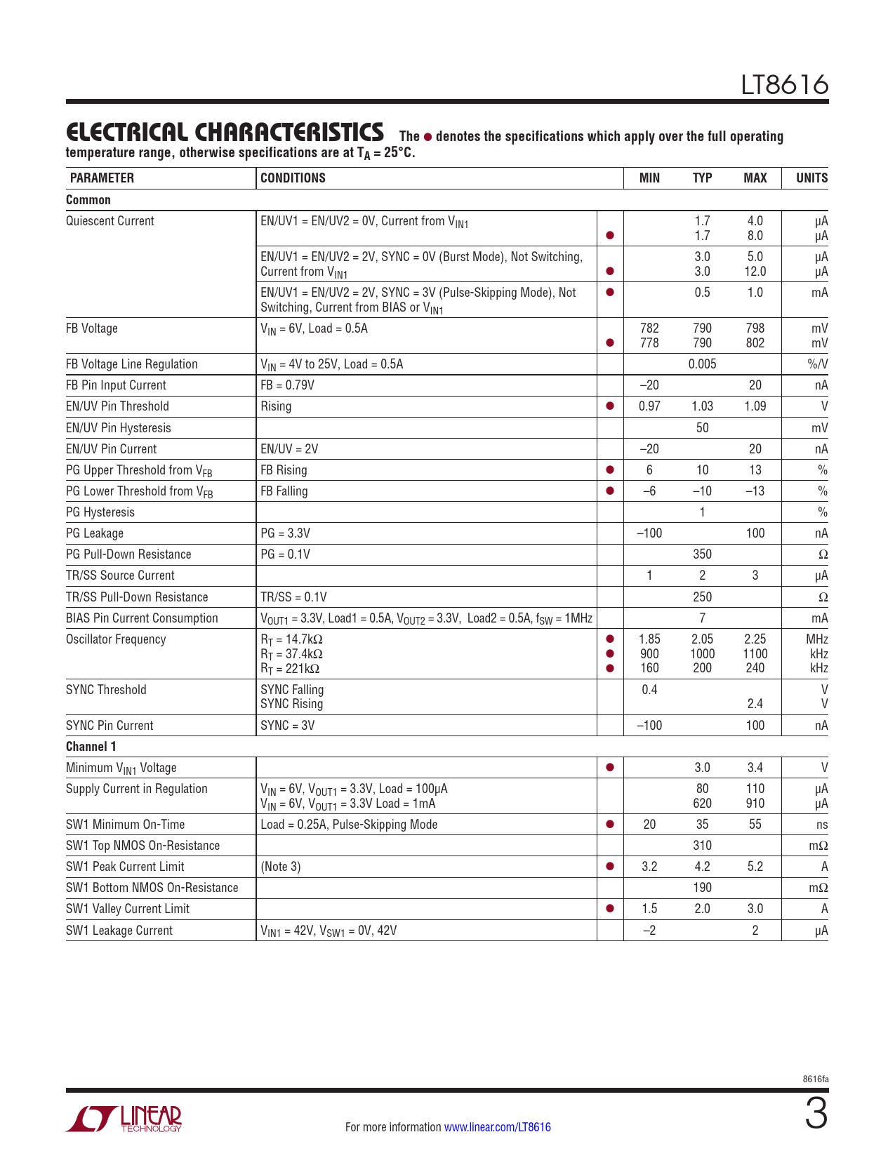 Minimum VIN1 Voltage l 3.0 3.4 V Supply Current in Regulation VIN = 6V, VOUT1 = 3.3V, Load = 100µA 80 110 µA VIN = 6V, VOUT1 = 3.3V Load = 1mA 620 910 µA SW1 Minimum On-Time Load = 0.25A, Pulse-Skipping Mode l 20 35 55 ns SW1 Top NMOS On-Resistance 310 mΩ SW1 Peak Current Limit (Note 3) l 3.2 4.2 5.2 A SW1 Bottom NMOS On-Resistance 190 mΩ SW1 Valley Current Limit l 1.5 2.0 3.0 A SW1 Leakage Current VIN1 = 42V, VSW1 = 0V, 42V –2 2 µA 8616fa For more information www.linear.com/LT8616 3