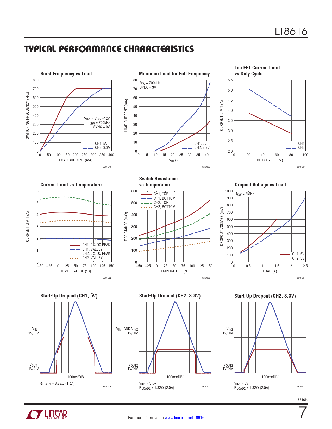 6 600 1000 CH1, TOP fSW = 2MHz CH1, BOTTOM 900 5 500 CH2, TOP CH2, BOTTOM 800 700 4 400 600 TAGE (mV) 3 ANCE (mΩ) 300 500 400 CURRENT LIMIT (A) 2 RESIST 200 300 CH1, 0% DC PEAK DROPOUT VOL 200 1 CH1, VALLEY 100 CH2, 0% DC PEAK 100 CH1, 5V CH2, VALLEY CH2, 5V 0 0 0 –50 –25 0 25 50 75 100 125 150 –50 –25 0 25 50 75 100 125 150 0 0.5 1 1.5 2 2.5 TEMPERATURE (°C) TEMPERATURE (°C) LOAD (A) 8616 G22 8616 G23 8616 G24