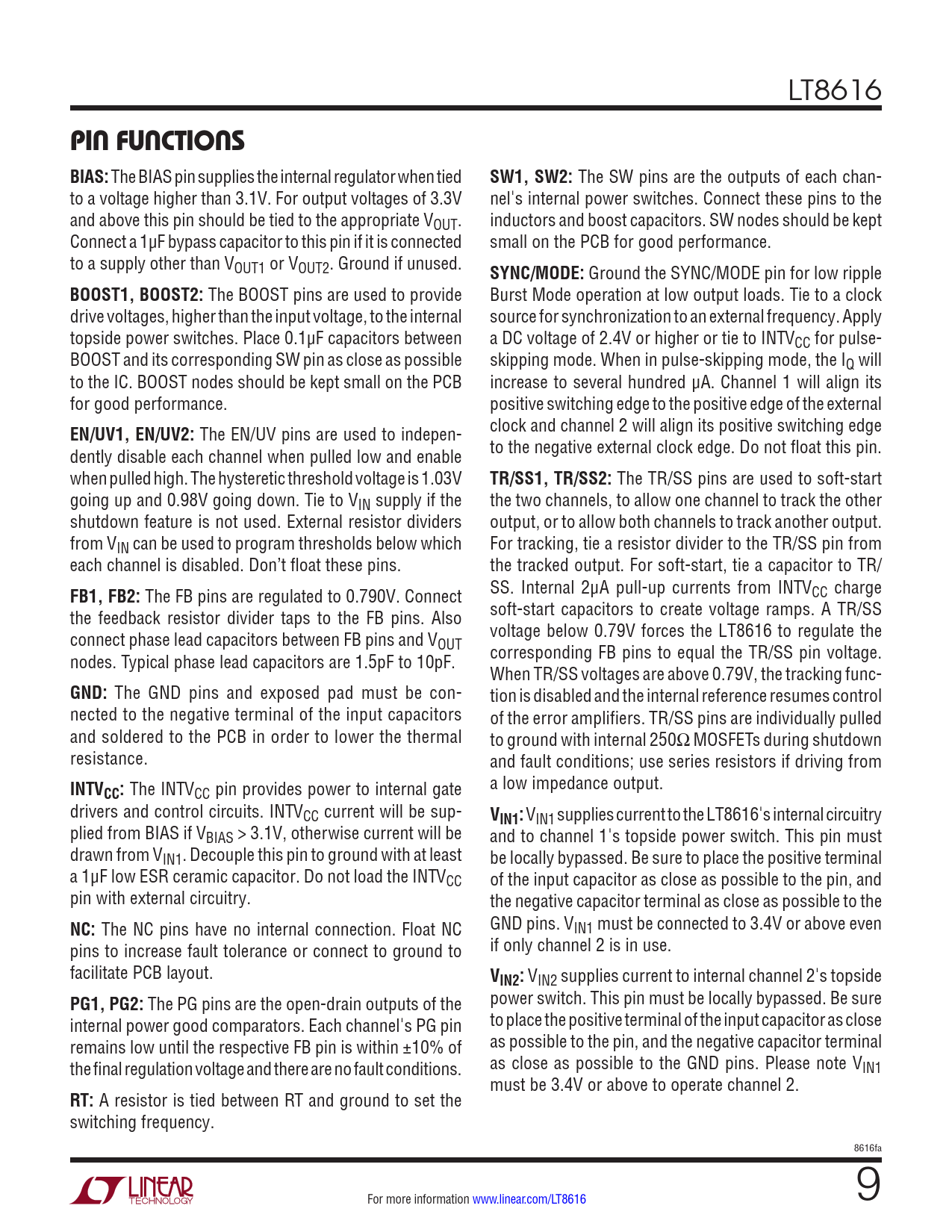 LT8616 PIN FUNCTIONS BIAS: The BIAS pin supplies the internal regulator when tied SW1, SW2: The SW pins are the outputs of each chan- to a voltage higher than 3.1V. For output voltages of 3.3V nel's internal power switches. Connect these pins to the and above this pin should be tied to the appropriate VOUT. inductors and boost capacitors. SW nodes should be kept Connect a 1µF bypass capacitor to this pin if it is connected small on the PCB for good performance. to a supply other than VOUT1 or VOUT2. Ground if unused. SYNC/MODE: Ground the SYNC/MODE pin for low ripple BOOST1, BOOST2: The BOOST pins are used to provide Burst Mode operation at low output loads. Tie to a clock drive voltages, higher than the input voltage, to the internal source for synchronization to an external frequency. Apply topside power switches. Place 0.1µF capacitors between a DC voltage of 2.4V or higher or tie to INTVCC for pulse- BOOST and its corresponding SW pin as close as possible skipping mode. When in pulse-skipping mode, the IQ will to the IC. BOOST nodes should be kept small on the PCB increase to several hundred μA. Channel 1 will align its for good performance. positive switching edge to the positive edge of the external EN/UV1, EN/UV2: The EN/UV pins are used to indepen- clock and channel 2 will align its positive switching edge dently disable each channel when pulled low and enable to the negative external clock edge. Do not float this pin. when pulled high. The hysteretic threshold voltage is 1.03V TR/SS1, TR/SS2: The TR/SS pins are used to soft-start going up and 0.98V going down. Tie to VIN supply if the the two channels, to allow one channel to track the other shutdown feature is not used. External resistor dividers output, or to allow both channels to track another output. from VIN can be used to program thresholds below which For tracking, tie a resistor divider to the TR/SS pin from each channel is disabled. Don’t float these pins. the tracked output. For soft-start, tie a capacitor to TR/ FB1, FB2: The FB pins are regulated to 0.790V. Connect SS. Internal 2μA pull-up currents from INTVCC charge the feedback resistor divider taps to the FB pins. Also soft-start capacitors to create voltage ramps. A TR/SS connect phase lead capacitors between FB pins and V voltage below 0.79V forces the LT8616 to regulate the OUT nodes. Typical phase lead capacitors are 1.5pF to 10pF. corresponding FB pins to equal the TR/SS pin voltage. When TR/SS voltages are above 0.79V, the tracking func- GND: The GND pins and exposed pad must be con- tion is disabled and the internal reference resumes control nected to the negative terminal of the input capacitors of the error amplifiers. TR/SS pins are individually pulled and soldered to the PCB in order to lower the thermal to ground with internal 250Ω MOSFETs during shutdown resistance. and fault conditions; use series resistors if driving from INTV a low impedance output. CC: The INTVCC pin provides power to internal gate drivers and control circuits. INTVCC current will be sup- VIN1: VIN1 supplies current to the LT8616's internal circuitry plied from BIAS if VBIAS > 3.1V, otherwise current will be and to channel 1's topside power switch. This pin must drawn from VIN1. Decouple this pin to ground with at least be locally bypassed. Be sure to place the positive terminal a 1μF low ESR ceramic capacitor. Do not load the INTVCC of the input capacitor as close as possible to the pin, and pin with external circuitry. the negative capacitor terminal as close as possible to the NC: The NC pins have no internal connection. Float NC GND pins. VIN1 must be connected to 3.4V or above even pins to increase fault tolerance or connect to ground to if only channel 2 is in use. facilitate PCB layout. VIN2: VIN2 supplies current to internal channel 2's topside PG1, PG2: The PG pins are the open-drain outputs of the power switch. This pin must be locally bypassed. Be sure internal power good comparators. Each channel's PG pin to place the positive terminal of the input capacitor as close remains low until the respective FB pin is within ±10% of as possible to the pin, and the negative capacitor terminal the final regulation voltage and there are no fault conditions. as close as possible to the GND pins. Please note VIN1 must be 3.4V or above to operate channel 2. RT: A resistor is tied between RT and ground to set the switching frequency. 8616fa For more information www.linear.com/LT8616 9