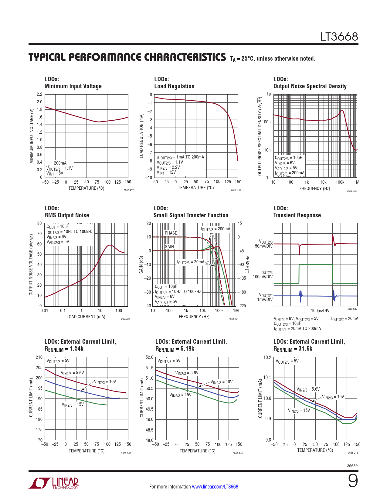 2.2 0 1µ ) 2.0 –1 Hz 1.8 –2 1.6 –3 1.4 100n –4 1.2 –5 1.0 0.8 –6 10n 0.6 –7 LOAD REGULATION (mV) ∆IOUT2/3 = 1mA TO 200mA COUT2/3 = 10µF MINIMUM INPUT VOLTAGE (V) 0.4 I –8 L = 200mA VOUT2/3 = 1.1V VIN2/3 = 6V 0.2 VOUT2/3 = 1.1V –9 VIN2/3 = 2.2V VADJ2/3 = 5V VIN1 = 5V VIN1 = 12V OUTPUT NOISE SPECTRAL DENSITY (V/√ IOUT2/3 = 200mA 0 –10 1n –50 –25 0 25 50 75 100 125 150 –50 –25 0 25 50 75 100 125 150 10 100 1k 10k 100k 1M TEMPERATURE (°C) TEMPERATURE (°C) FREQUENCY (Hz) 3667 G37 3668 G38 3668 G39