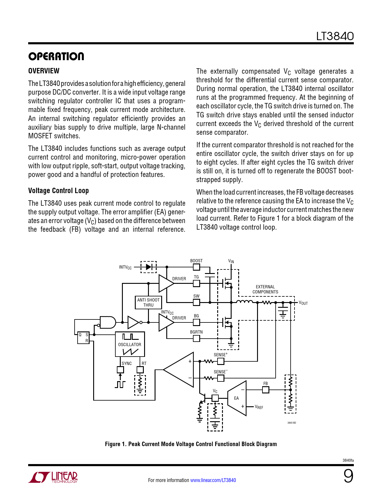 When the load current increases, the FB voltage decreases The LT3840 uses peak current mode control to regulate relative to the reference causing the EA to increase the VC the supply output voltage. The error amplifier (EA) gener- voltage until the average inductor current matches the new ates an error voltage (V load current. Refer to Figure 1 for a block diagram of the C) based on the difference between the feedback (FB) voltage and an internal reference. LT3840 voltage control loop. BOOST VIN INTVCC TG DRIVER EXTERNAL COMPONENTS SW ANTI SHOOT VOUT THRU INTVCCDRIVER BG BGRTN Q S R OSCILLATOR SENSE+ + SYNC RT SENSE– – FB – VC EA + VREF 3840 BD
