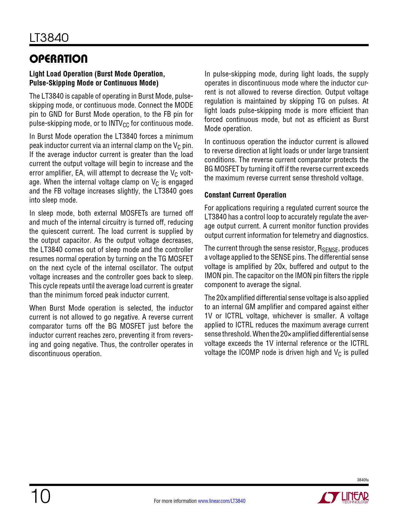 LT3840 operaTion Light Load Operation (Burst Mode Operation, In pulse-skipping mode, during light loads, the supply Pulse-Skipping Mode or Continuous Mode) operates in discontinuous mode where the inductor cur- The LT3840 is capable of operating in Burst Mode, pulse- rent is not allowed to reverse direction. Output voltage skipping mode, or continuous mode. Connect the MODE regulation is maintained by skipping TG on pulses. At pin to GND for Burst Mode operation, to the FB pin for light loads pulse-skipping mode is more efficient than pulse-skipping mode, or to INTV forced continuous mode, but not as efficient as Burst CC for continuous mode. Mode operation. In Burst Mode operation the LT3840 forces a minimum peak inductor current via an internal clamp on the V In continuous operation the inductor current is allowed C pin. If the average inductor current is greater than the load to reverse direction at light loads or under large transient current the output voltage will begin to increase and the conditions. The reverse current comparator protects the error amplifier, EA, will attempt to decrease the V BG MOSFET by turning it off if the reverse current exceeds C volt- age. When the internal voltage clamp on V the maximum reverse current sense threshold voltage. C is engaged and the FB voltage increases slightly, the LT3840 goes Constant Current Operation into sleep mode. For applications requiring a regulated current source the In sleep mode, both external MOSFETs are turned off LT3840 has a control loop to accurately regulate the aver- and much of the internal circuitry is turned off, reducing age output current. A current monitor function provides the quiescent current. The load current is supplied by output current information for telemetry and diagnostics. the output capacitor. As the output voltage decreases, the LT3840 comes out of sleep mode and the controller The current through the sense resistor, RSENSE, produces resumes normal operation by turning on the TG MOSFET a voltage applied to the SENSE pins. The differential sense on the next cycle of the internal oscillator. The output voltage is amplified by 20x, buffered and output to the voltage increases and the controller goes back to sleep. IMON pin. The capacitor on the IMON pin filters the ripple This cycle repeats until the average load current is greater component to average the signal. than the minimum forced peak inductor current. The 20x amplified differential sense voltage is also applied When Burst Mode operation is selected, the inductor to an internal GM amplifier and compared against either current is not allowed to go negative. A reverse current 1V or ICTRL voltage, whichever is smaller. A voltage comparator turns off the BG MOSFET just before the applied to ICTRL reduces the maximum average current inductor current reaches zero, preventing it from revers- sense threshold. When the 20× amplified differential sense ing and going negative. Thus, the controller operates in voltage exceeds the 1V internal reference or the ICTRL discontinuous operation. voltage the ICOMP node is driven high and VC is pulled 3840fa 10 For more information www.linear.com/LT3840 Document Outline Features Description Applications Typical Application Absolute Maximum Ratings Pin Configuration Order Information Electrical Characteristics Typical Performance Characteristics Pin Functions Operation Applications Information Typical Applications Package Description Revision History Typical Application Related Parts