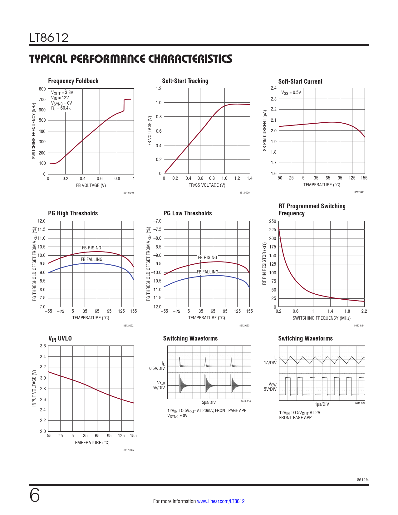 800 1.2 2.4 VOUT = 3.3V VSS = 0.5V 700 VIN = 12V 2.3 VSYNC = 0V 1.0 600 RT = 60.4k 2.2 0.8 500 2.1 400 0.6 2.0 300 FB VOLTAGE (V) 1.9 0.4 SS PIN CURRENT (µA) 200 1.8 SWITCHING FREQUENCY (kHz) 0.2 100 1.7 0 0 1.6 0 0.2 0.4 0.6 0.8 1 0 0.2 0.4 0.6 0.8 1.0 1.2 1.4 –50 –25 5 35 65 95 125 155 FB VOLTAGE (V) TR/SS VOLTAGE (V) TEMPERATURE (°C) 8612 G19 8612 G20 8612 G21
