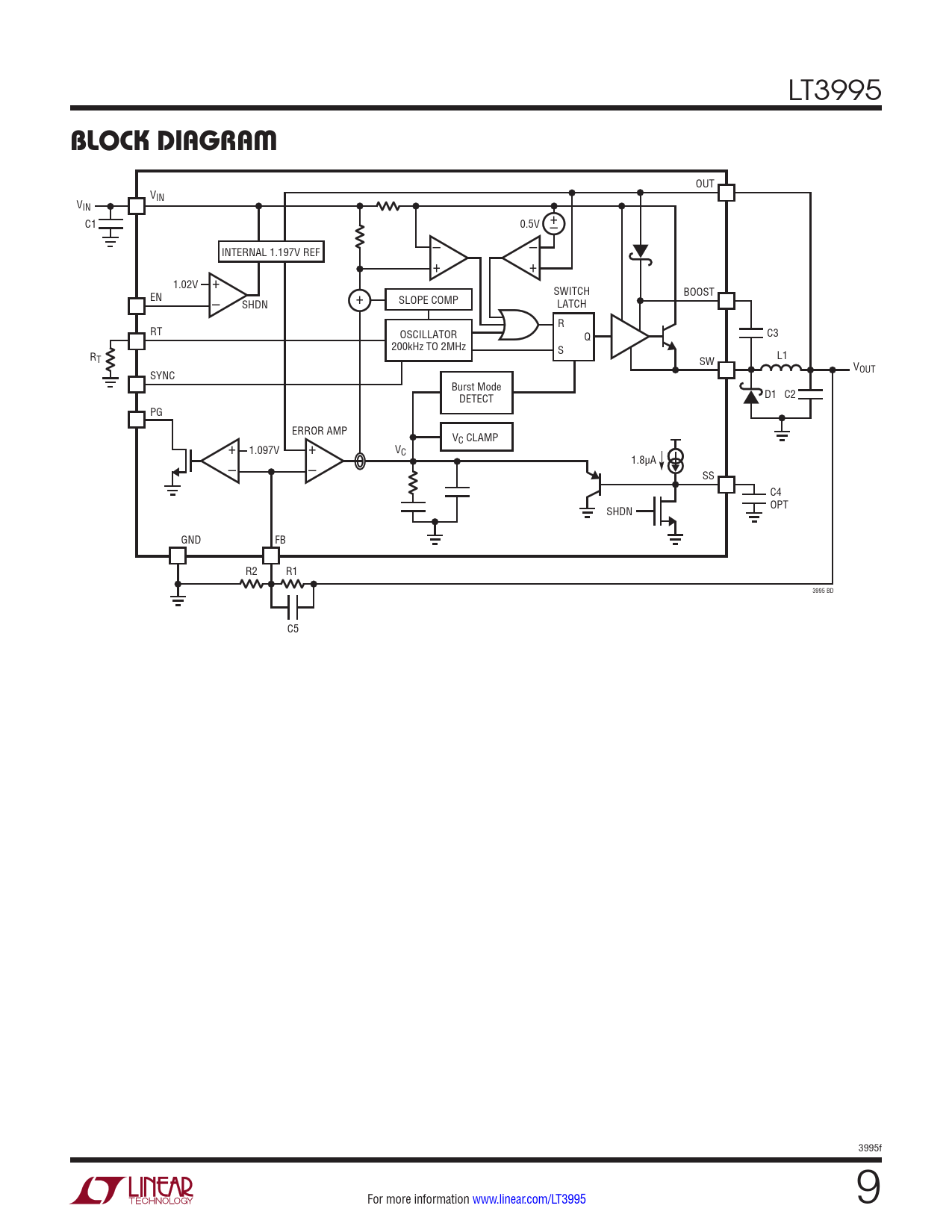 OUT VIN VIN C1 0.5V + – – – INTERNAL 1.197V REF + + 1.02V + EN SWITCH BOOST SLOPE COMP – SHDN + LATCH R RT OSCILLATOR C3 Q 200kHz TO 2MHz R S T SW L1 VOUT SYNC Burst Mode DETECT D1 C2 PG ERROR AMP V + 1.097V + C CLAMP VC 1.8µA – – SS C4 SHDN OPT GND FB R2 R1 3995 BD C5 3995f For more information www.linear.com/LT3995 9 Document Outline Features Applications Description Typical Application Absolute Maximum Ratings Order Information Electrical Characteristics Typical Performance Characteristics Pin Functions Block Diagram Operation Applications Information Typical Applications Package Description Typical Application Related Parts