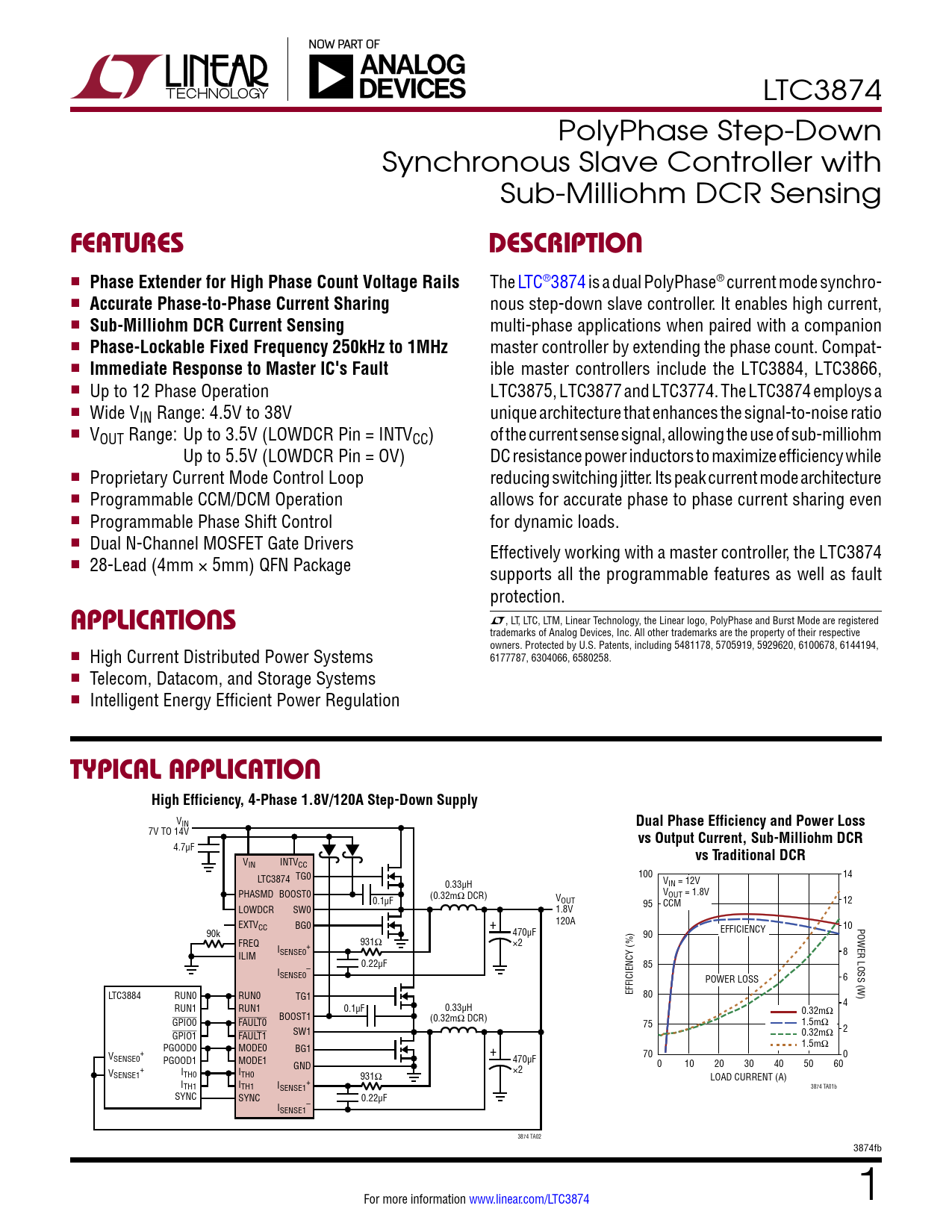 ible master controllers include the LTC3884, LTC3866, n Up to 12 Phase Operation LTC3875, LTC3877 and LTC3774. The LTC3874 employs a n Wide VIN Range: 4.5V to 38V unique architecture that enhances the signal-to-noise ratio n VOUT Range: Up to 3.5V (LOWDCR Pin = INTVCC) of the current sense signal, allowing the use of sub-milliohm Up to 5.5V (LOWDCR Pin = OV) DC resistance power inductors to maximize efficiency while n Proprietary Current Mode Control Loop reducing switching jitter. Its peak current mode architecture n Programmable CCM/DCM Operation allows for accurate phase to phase current sharing even n Programmable Phase Shift Control for dynamic loads. n Dual N-Channel MOSFET Gate Drivers Effectively working with a master controller, the LTC3874 n 28-Lead (4mm × 5mm) QFN Package supports all the programmable features as well as fault protection. L, LT, LTC, LTM, Linear Technology, the Linear logo, PolyPhase and Burst Mode are registered