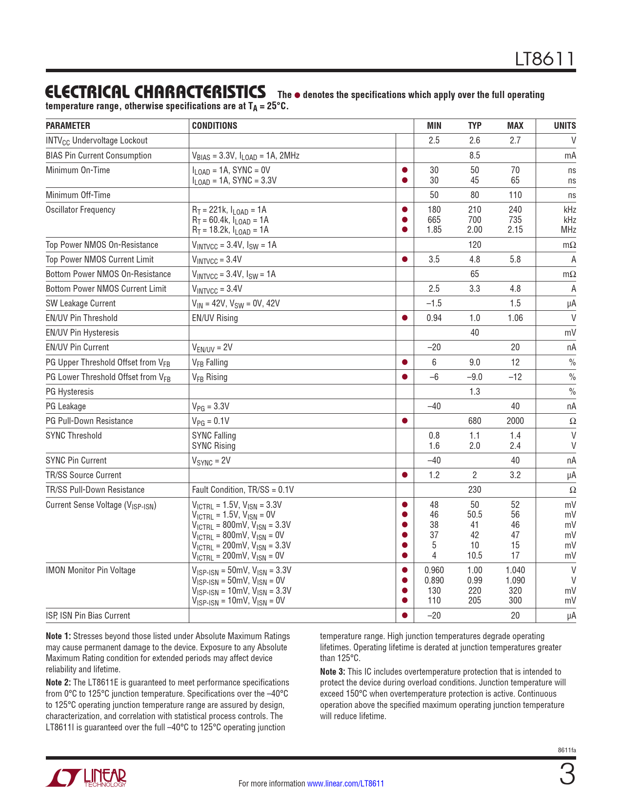 INTVCC Undervoltage Lockout 2.5 2.6 2.7 V BIAS Pin Current Consumption VBIAS = 3.3V, ILOAD = 1A, 2MHz 8.5 mA Minimum On-Time ILOAD = 1A, SYNC = 0V l 30 50 70 ns ILOAD = 1A, SYNC = 3.3V l 30 45 65 ns Minimum Off-Time 50 80 110 ns Oscillator Frequency RT = 221k, ILOAD = 1A l 180 210 240 kHz RT = 60.4k, ILOAD = 1A l 665 700 735 kHz RT = 18.2k, ILOAD = 1A l 1.85 2.00 2.15 MHz Top Power NMOS On-Resistance VINTVCC = 3.4V, ISW = 1A 120 mΩ Top Power NMOS Current Limit VINTVCC = 3.4V l 3.5 4.8 5.8 A Bottom Power NMOS On-Resistance VINTVCC = 3.4V, ISW = 1A 65 mΩ Bottom Power NMOS Current Limit VINTVCC = 3.4V 2.5 3.3 4.8 A SW Leakage Current VIN = 42V, VSW = 0V, 42V –1.5 1.5 µA EN/UV Pin Threshold EN/UV Rising l 0.94 1.0 1.06 V EN/UV Pin Hysteresis 40 mV EN/UV Pin Current VEN/UV = 2V –20 20 nA PG Upper Threshold Offset from VFB VFB Falling l 6 9.0 12 % PG Lower Threshold Offset from VFB VFB Rising l –6 –9.0 –12 % PG Hysteresis 1.3 % PG Leakage VPG = 3.3V –40 40 nA PG Pull-Down Resistance VPG = 0.1V l 680 2000 Ω SYNC Threshold SYNC Falling 0.8 1.1 1.4 V SYNC Rising 1.6 2.0 2.4 V SYNC Pin Current VSYNC = 2V –40 40 nA TR/SS Source Current l 1.2 2 3.2 µA TR/SS Pull-Down Resistance Fault Condition, TR/SS = 0.1V 230 Ω Current Sense Voltage (VISP-ISN) VICTRL = 1.5V, VISN = 3.3V l 48 50 52 mV VICTRL = 1.5V, VISN = 0V l 46 50.5 56 mV VICTRL = 800mV, VISN = 3.3V l 38 41 46 mV VICTRL = 800mV, VISN = 0V l 37 42 47 mV VICTRL = 200mV, VISN = 3.3V l 5 10 15 mV VICTRL = 200mV, VISN = 0V l 4 10.5 17 mV IMON Monitor Pin Voltage VISP-ISN = 50mV, VISN = 3.3V l 0.960 1.00 1.040 V VISP-ISN = 50mV, VISN = 0V l 0.890 0.99 1.090 V VISP-ISN = 10mV, VISN = 3.3V l 130 220 320 mV VISP-ISN = 10mV, VISN = 0V l 110 205 300 mV ISP, ISN Pin Bias Current l –20 20 µA
