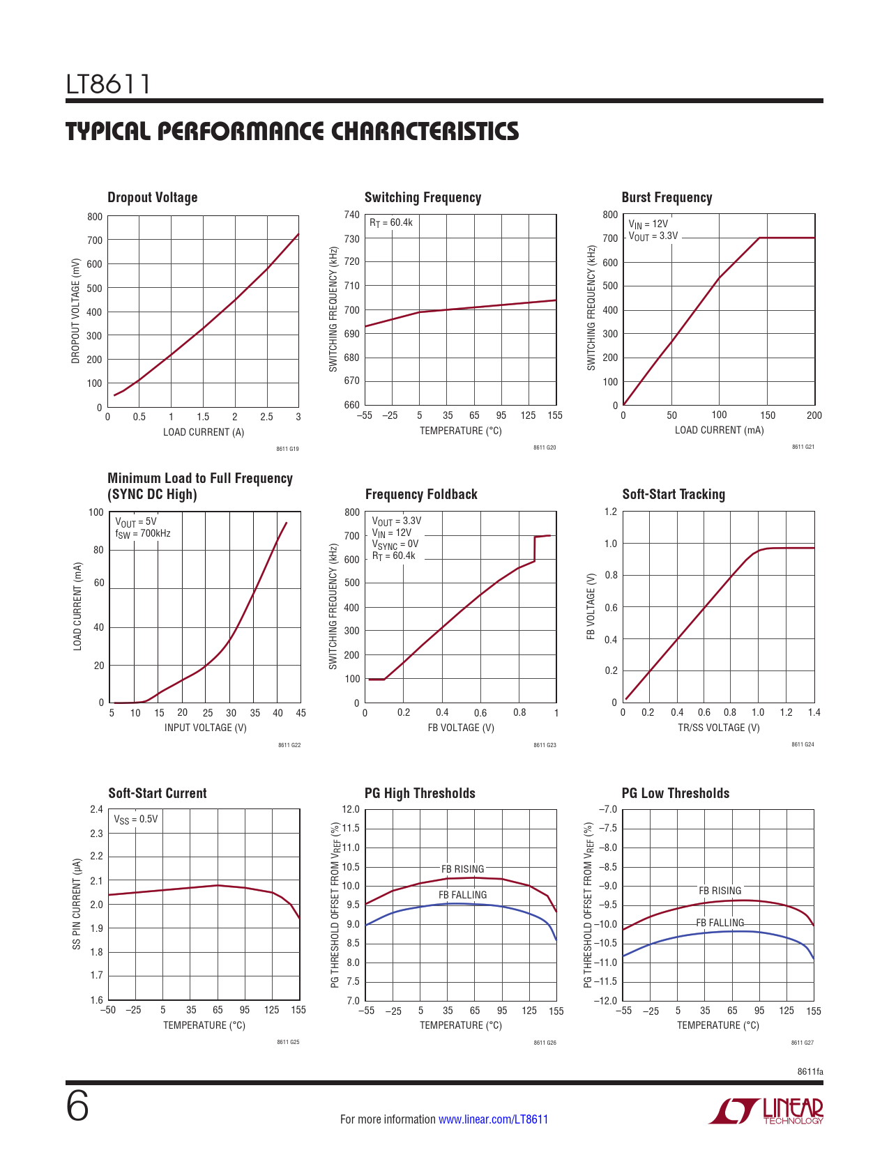 100 800 1.2 VOUT = 5V VOUT = 3.3V fSW = 700kHz 700 VIN = 12V 80 VSYNC = 0V 1.0 600 RT = 60.4k 0.8 60 500 400 0.6 40 300 FB VOLTAGE (V) 0.4 LOAD CURRENT (mA) 200 20 SWITCHING FREQUENCY (kHz) 0.2 100 0 0 0 5 10 15 20 25 30 35 40 45 0 0.2 0.4 0.6 0.8 1 0 0.2 0.4 0.6 0.8 1.0 1.2 1.4 INPUT VOLTAGE (V) FB VOLTAGE (V) TR/SS VOLTAGE (V) 8611 G22 8611 G23 8611 G24