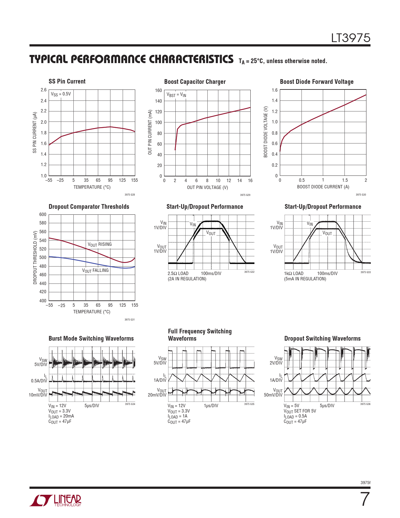 2.6 160 1.6 VSS = 0.5V VBST = VIN 2.4 140 1.4 2.2 120 1.2 2.0 100 1.0 1.8 80 0.8 1.6 60 0.6 SS PIN CURRENT (µA) 1.4 OUT PIN CURRENT (mA) 40 BOOST DIODE VOLTAGE (V) 0.4 1.2 20 0.2 1.0 0 0 –55 –25 5 35 65 95 125 155 0 2 4 6 8 10 12 14 16 0 0.5 1 1.5 2 TEMPERATURE (°C) OUT PIN VOLTAGE (V) BOOST DIODE CURRENT (A) 3975 G28 3975 G29 3975 G30