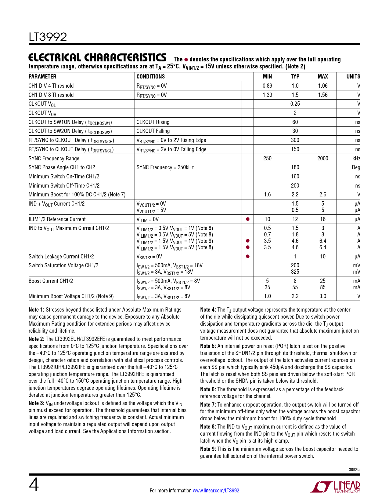 LT3992 elecTrical characTerisTicsThe l denotes the specifications which apply over the full operatingtemperature range, otherwise specifications are at TA = 25°C. VVIN1/2 = 15V unless otherwise specified. (Note 2) PARAMETERCONDITIONSMINTYPMAXUNITS CH1 DIV 4 Threshold RRT/SYNC = 0V 0.89 1.0 1.06 V CH1 DIV 8 Threshold RRT/SYNC = 0V 1.39 1.5 1.56 V CLKOUT VOL 0.25 V CLKOUT VOH 2 V CLKOUT to SW1ON Delay ( tDCLKOSW1) CLKOUT Rising 60 ns CLKOUT to SW2ON Delay ( tDCLKOSW2) CLKOUT Falling 30 ns RT/SYNC to CLKOUT Delay ( tDRTSYNCH) VRT/SYNC = 0V to 2V Rising Edge 300 ns RT/SYNC to CLKOUT Delay ( tDRTSYNCL) VRT/SYNC = 2V to 0V Falling Edge 150 ns SYNC Frequency Range 250 2000 kHz SYNC Phase Angle CH1 to CH2 SYNC Frequency = 250kHz 180 Deg Minimum Switch On-Time CH1/2 160 ns Minimum Switch Off-Time CH1/2 200 ns Minimum Boost for 100% DC CH1/2 (Note 7) 1.6 2.2 2.6 V IND + VOUT Current CH1/2 VVOUT1/2 = 0V 1.5 5 µA VVOUT1/2 = 5V 0.5 5 µA ILIM1/2 Reference Current VILIM = 0V l 10 12 16 µA IND to VOUT Maximum Current CH1/2 VILIM1/2 = 0.5V, VVOUT = 1V (Note 8) 0.5 1.5 3 A VILIM1/2 = 0.5V, VVOUT = 5V (Note 8) 0.7 1.8 3 A VILIM1/2 = 1.5V, VVOUT = 1V (Note 8) l 3.5 4.6 6.4 A VILIM1/2 = 1.5V, VVOUT = 5V (Note 8) l 3.5 4.6 6.4 A Switch Leakage Current CH1/2 VSW1/2 = 0V l 1 10 µA Switch Saturation Voltage CH1/2 ISW1/2 = 500mA, VBST1/2 = 18V 200 mV ISW1/2 = 3A, VBST1/2 = 18V 325 mV Boost Current CH1/2 ISW1/2 = 500mA, VBST1/2 = 8V 5 8 25 mA ISW1/2 = 3A, VBST1/2 = 8V 35 55 85 mA Minimum Boost Voltage CH1/2 (Note 9) ISW1/2 = 3A, VBST1/2 = 8V 1.0 2.2 3.0 V Note 1: Stresses beyond those listed under Absolute Maximum Ratings Note 4: The TJ output voltage represents the temperature at the center may cause permanent damage to the device. Exposure to any Absolute of the die while dissipating quiescent power. Due to switch power Maximum Rating condition for extended periods may affect device dissipation and temperature gradients across the die, the TJ output reliability and lifetime. voltage measurement does not guarantee that absolute maximum junction Note 2: The LT3992EUH/LT3992EFE is guaranteed to meet performance temperature will not be exceeded. specifications from 0°C to 125°C junction temperature. Specifications over Note 5: An internal power on reset (POR) latch is set on the positive the –40°C to 125°C operating junction temperature range are assured by transition of the SHDN1/2 pin through its threshold, thermal shutdown or design, characterization and correlation with statistical process controls. overvoltage lockout. The output of the latch activates current sources on The LT3992IUH/LT3992IFE is guaranteed over the full –40°C to 125°C each SS pin which typically sink 450µA and discharge the SS capacitor. operating junction temperature range. The LT3992HFE is guaranteed The latch is reset when both SS pins are driven below the soft-start POR over the full –40°C to 150°C operating junction temperature range. High threshold or the SHDN pin is taken below its threshold. junction temperatures degrade operating lifetimes. Operating lifetime is Note 6: The threshold is expressed as a percentage of the feedback derated at junction temperatures greater than 125°C. reference voltage for the channel. Note 3: VIN undervoltage lockout is defined as the voltage which the VIN Note 7: To enhance dropout operation, the output switch will be turned off pin must exceed for operation. The threshold guarantees that internal bias for the minimum off-time only when the voltage across the boost capacitor lines are regulated and switching frequency is constant. Actual minimum drops below the minimum boost for 100% duty cycle threshold. input voltage to maintain a regulated output will depend upon output Note 8: The IND to V voltage and load current. See the Applications Information section. OUT maximum current is defined as the value of current flowing from the IND pin to the VOUT pin which resets the switch latch when the VC pin is at its high clamp. Note 9: This is the minimum voltage across the boost capacitor needed to guarantee full saturation of the internal power switch. 3992fa 4 For more information www.linear.com/LT3992 Document Outline Features Applications Description Typical Application Absolute Maximum Ratings Pin Configuration Order Information Electrical Characteristics Typical Performance Characteristics Pin Functions Block Diagram Applications Information Typical Applications Package Description Typical Application Related Parts