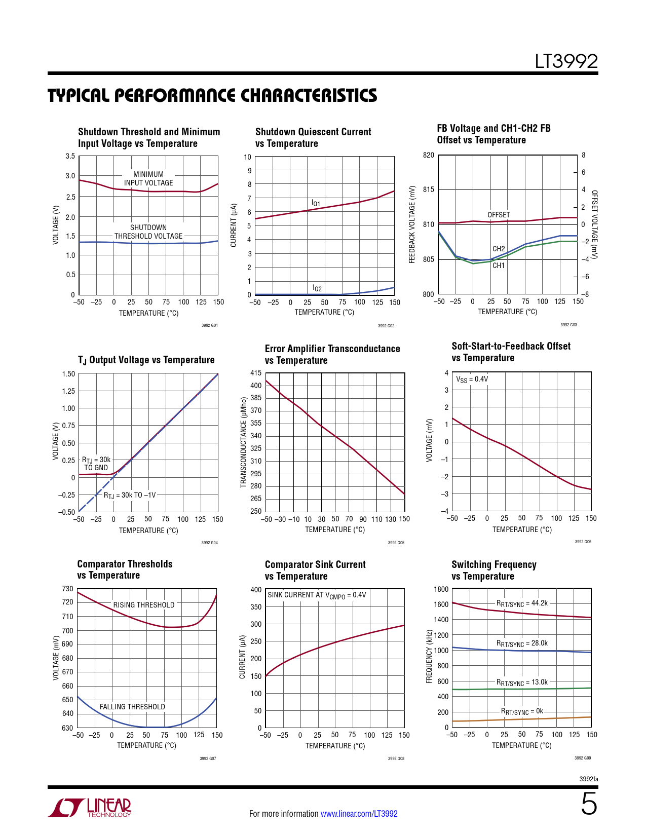 3.5 10 820 8 9 3.0 MINIMUM 6 INPUT VOLTAGE 8 OFFSET VOLTAGE (mV) 815 4 2.5 7 IQ1 2 6 2.0 OFFSET SHUTDOWN 5 810 0 1.5 THRESHOLD VOLTAGE VOLTAGE (V) 4 CURRENT (µA) –2 CH2 1.0 3 FEEDBACK VOLTAGE (mV) 805 –4 2 CH1 0.5 1 –6 IQ2 0 0 800 –8 –50 –25 0 25 50 75 100 125 150 –50 –25 0 25 50 75 100 125 150 –50 –25 0 25 50 75 100 125 150 TEMPERATURE (°C) TEMPERATURE (°C) TEMPERATURE (°C) 3992 G01 3992 G02 3992 G03