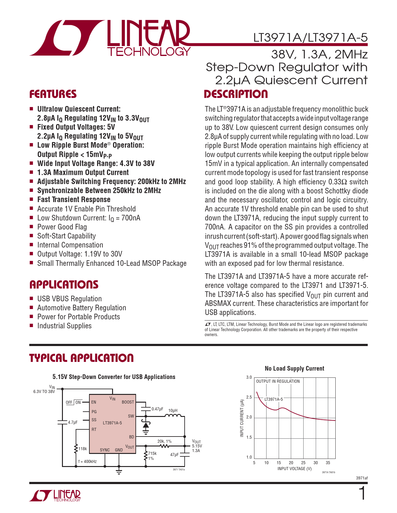 erence voltage compared to the LT3971 and LT3971-5. The LT3971A-5 also has specified VOUT pin current and n USB VBUS Regulation ABSMAX current. These characteristics are important for n Automotive Battery Regulation USB applications. n Power for Portable Products L, LT, LTC, LTM, Linear Technology, Burst Mode and the Linear logo are registered trademarks n Industrial Supplies of Linear Technology Corporation. All other trademarks are the property of their respective owners.
