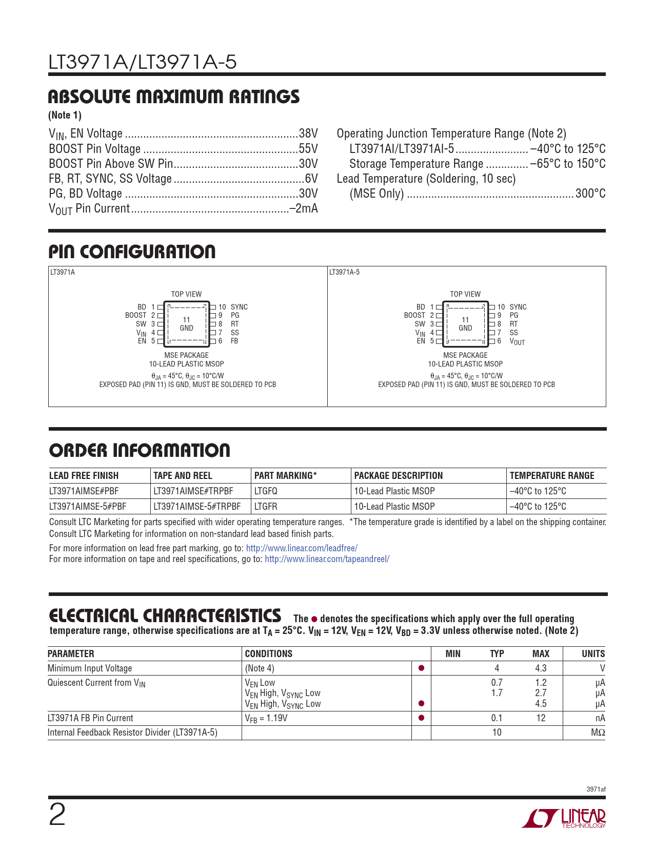 LT3971A/LT3971A-5 ABSOLUTE MAXIMUM RATINGS(Note 1) VIN, EN Voltage ...38V Operating Junction Temperature Range (Note 2) BOOST Pin Voltage ...55V LT3971AI/LT3971AI-5 .. –40°C to 125°C BOOST Pin Above SW Pin ...30V Storage Temperature Range .. –65°C to 150°C FB, RT, SYNC, SS Voltage ...6V Lead Temperature (Soldering, 10 sec) PG, BD Voltage ...30V (MSE Only) ... 300°C VOUT Pin Current ..–2mA PIN CONFIGURATION LT3971A LT3971A-5 TOP VIEW TOP VIEW BD 1 10 SYNC BD 1 10 SYNC BOOST 2 9 PG BOOST 2 9 PG 11 11 SW 3 8 RT SW 3 8 RT GND GND V 4 IN 7 SS V 4 IN 7 SS EN 5 6 FB EN 5 6 VOUT MSE PACKAGE MSE PACKAGE 10-LEAD PLASTIC MSOP 10-LEAD PLASTIC MSOP θJA = 45°C, θJC = 10°C/W θJA = 45°C, θJC = 10°C/W EXPOSED PAD (PIN 11) IS GND, MUST BE SOLDERED TO PCB EXPOSED PAD (PIN 11) IS GND, MUST BE SOLDERED TO PCB ORDER INFORMATIONLEAD FREE FINISHTAPE AND REELPART MARKING*PACKAGE DESCRIPTIONTEMPERATURE RANGE LT3971AIMSE#PBF LT3971AIMSE#TRPBF LTGFQ 10-Lead Plastic MSOP –40°C to 125°C LT3971AIMSE-5#PBF LT3971AIMSE-5#TRPBF LTGFR 10-Lead Plastic MSOP –40°C to 125°C Consult LTC Marketing for parts specified with wider operating temperature ranges. *The temperature grade is identified by a label on the shipping container. Consult LTC Marketing for information on non-standard lead based finish parts. For more information on lead free part marking, go to: http://www.linear.com/leadfree/ For more information on tape and reel specifications, go to: http://www.linear.com/tapeandreel/ ELECTRICAL CHARACTERISTICSThe l denotes the specifications which apply over the full operatingtemperature range, otherwise specifications are at TA = 25°C. VIN = 12V, VEN = 12V, VBD = 3.3V unless otherwise noted. (Note 2)PARAMETERCONDITIONSMINTYPMAXUNITS Minimum Input Voltage (Note 4) l 4 4.3 V Quiescent Current from VIN VEN Low 0.7 1.2 μA VEN High, VSYNC Low 1.7 2.7 μA VEN High, VSYNC Low l 4.5 μA LT3971A FB Pin Current VFB = 1.19V l 0.1 12 nA Internal Feedback Resistor Divider (LT3971A-5) 10 MΩ 3971af 2 Document Outline FEATURES DESCRIPTION APPLICATIONS TYPICAL APPLICATION ABSOLUTE MAXIMUM RATINGS PIN CONFIGURATION ORDER INFORMATION ELECTRICAL CHARACTERISTICS TYPICAL PERFORMANCE CHARACTERISTICS PIN FUNCTIONS BLOCK DIAGRAM OPERATION APPLICATIONS INFORMATION TYPICAL APPLICATIONS PACKAGE DESCRIPTION TYPICAL APPLICATION RELATED PARTS