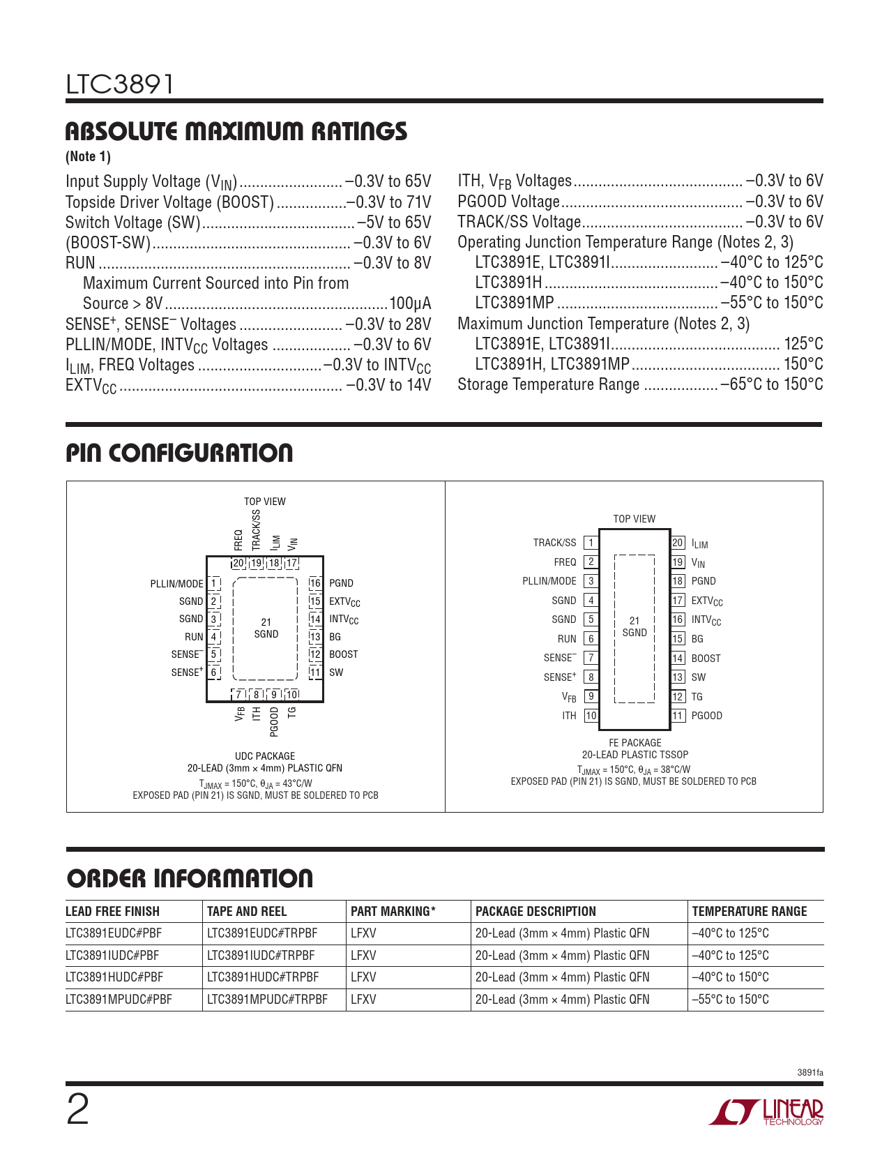 LTC3891EUDC#PBF LTC3891EUDC#TRPBF LFXV 20-Lead (3mm × 4mm) Plastic QFN –40°C to 125°C LTC3891IUDC#PBF LTC3891IUDC#TRPBF LFXV 20-Lead (3mm × 4mm) Plastic QFN –40°C to 125°C LTC3891HUDC#PBF LTC3891HUDC#TRPBF LFXV 20-Lead (3mm × 4mm) Plastic QFN –40°C to 150°C LTC3891MPUDC#PBF LTC3891MPUDC#TRPBF LFXV 20-Lead (3mm × 4mm) Plastic QFN –55°C to 150°C 3891fa 2 Document Outline Features Applications Description Typical Application Absolute Maximum Ratings Pin Configuration Order Information Electrical Characteristics Typical Performance Characteristics Pin Functions FUNCTIONAL Diagram Operation Applications Information Package Description Revision History Typical Application Related Parts