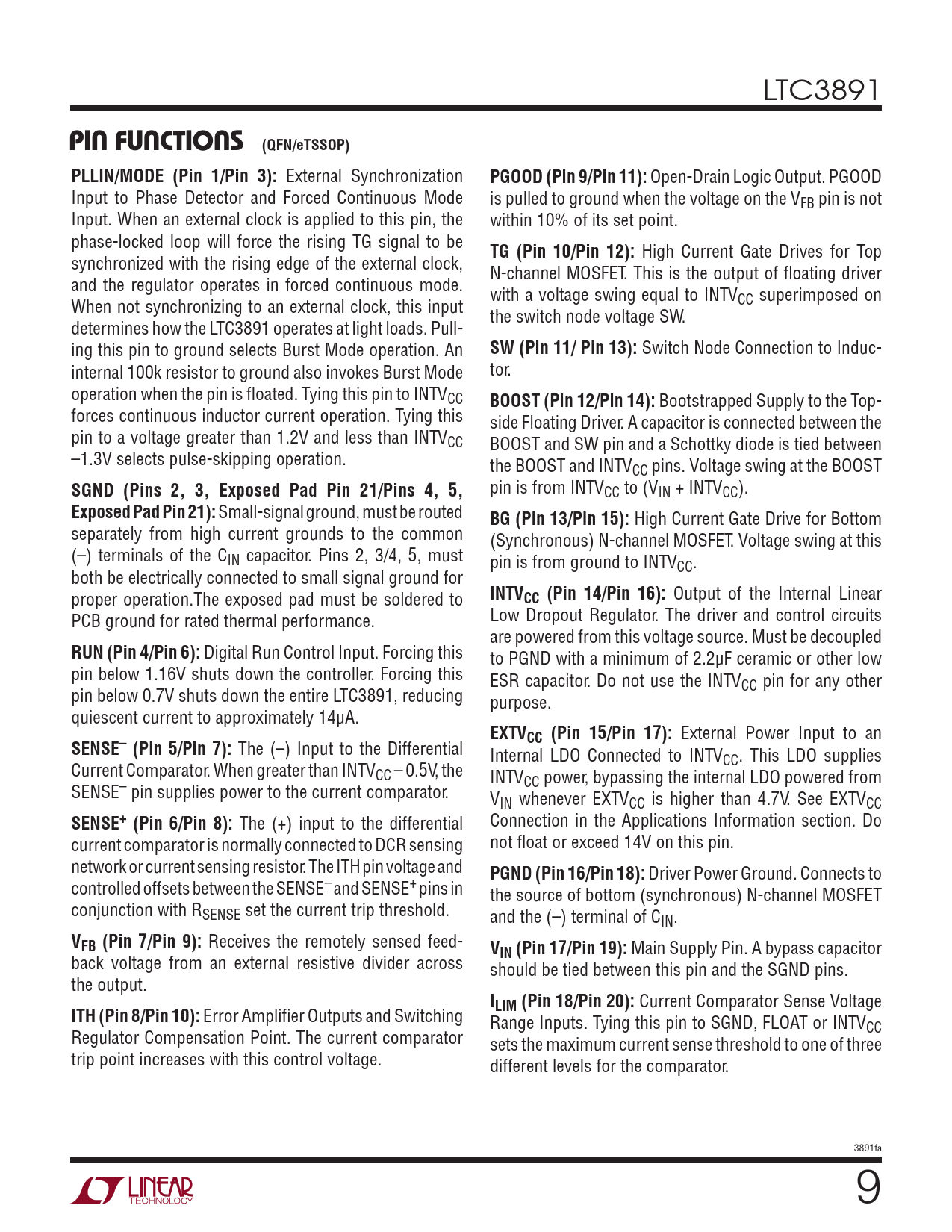 LTC3891 PIN FUNCTIONS (QFN/eTSSOP)PLLIN/MODE (Pin 1/Pin 3): External Synchronization PGOOD (Pin 9/Pin 11): Open-Drain Logic Output. PGOOD Input to Phase Detector and Forced Continuous Mode is pulled to ground when the voltage on the VFB pin is not Input. When an external clock is applied to this pin, the within 10% of its set point. phase-locked loop will force the rising TG signal to be TG (Pin 10/Pin 12): High Current Gate Drives for Top synchronized with the rising edge of the external clock, N-channel MOSFET. This is the output of floating driver and the regulator operates in forced continuous mode. with a voltage swing equal to INTV When not synchronizing to an external clock, this input CC superimposed on the switch node voltage SW. determines how the LTC3891 operates at light loads. Pull- ing this pin to ground selects Burst Mode operation. An SW (Pin 11/ Pin 13): Switch Node Connection to Induc- internal 100k resistor to ground also invokes Burst Mode tor. operation when the pin is floated. Tying this pin to INTVCC BOOST (Pin 12/Pin 14): Bootstrapped Supply to the Top- forces continuous inductor current operation. Tying this side Floating Driver. A capacitor is connected between the pin to a voltage greater than 1.2V and less than INTVCC BOOST and SW pin and a Schottky diode is tied between –1.3V selects pulse-skipping operation. the BOOST and INTVCC pins. Voltage swing at the BOOST SGND (Pins 2, 3, Exposed Pad Pin 21/Pins 4, 5, pin is from INTVCC to (VIN + INTVCC). Exposed Pad Pin 21): Small-signal ground, must be routed BG (Pin 13/Pin 15): High Current Gate Drive for Bottom separately from high current grounds to the common (Synchronous) N-channel MOSFET. Voltage swing at this (–) terminals of the CIN capacitor. Pins 2, 3/4, 5, must pin is from ground to INTV both be electrically connected to small signal ground for CC. proper operation.The exposed pad must be soldered to INTVCC (Pin 14/Pin 16): Output of the Internal Linear PCB ground for rated thermal performance. Low Dropout Regulator. The driver and control circuits are powered from this voltage source. Must be decoupled RUN (Pin 4/Pin 6): Digital Run Control Input. Forcing this to PGND with a minimum of 2.2µF ceramic or other low pin below 1.16V shuts down the controller. Forcing this ESR capacitor. Do not use the INTV pin below 0.7V shuts down the entire LTC3891, reducing CC pin for any other purpose. quiescent current to approximately 14µA. EXTVSENSE– (Pin 5/Pin 7): The (–) Input to the Differential CC (Pin 15/Pin 17): External Power Input to an Internal LDO Connected to INTV Current Comparator. When greater than INTV CC. This LDO supplies CC – 0.5V, the INTV SENSE– pin supplies power to the current comparator. CC power, bypassing the internal LDO powered from VIN whenever EXTVCC is higher than 4.7V. See EXTVCC SENSE+ (Pin 6/Pin 8): The (+) input to the differential Connection in the Applications Information section. Do current comparator is normally connected to DCR sensing not float or exceed 14V on this pin. network or current sensing resistor. The ITH pin voltage and PGND (Pin 16/Pin 18): Driver Power Ground. Connects to control ed offsets between the SENSE– and SENSE+ pins in the source of bottom (synchronous) N-channel MOSFET conjunction with RSENSE set the current trip threshold. and the (–) terminal of CIN. VFB (Pin 7/Pin 9): Receives the remotely sensed feed- V back voltage from an external resistive divider across IN (Pin 17/Pin 19): Main Supply Pin. A bypass capacitor should be tied between this pin and the SGND pins. the output. IITH (Pin 8/Pin 10): Error Amplifier Outputs and Switching LIM (Pin 18/Pin 20): Current Comparator Sense Voltage Range Inputs. Tying this pin to SGND, FLOAT or INTV Regulator Compensation Point. The current comparator CC sets the maximum current sense threshold to one of three trip point increases with this control voltage. different levels for the comparator. 3891fa 9 Document Outline Features Applications Description Typical Application Absolute Maximum Ratings Pin Configuration Order Information Electrical Characteristics Typical Performance Characteristics Pin Functions FUNCTIONAL Diagram Operation Applications Information Package Description Revision History Typical Application Related Parts
