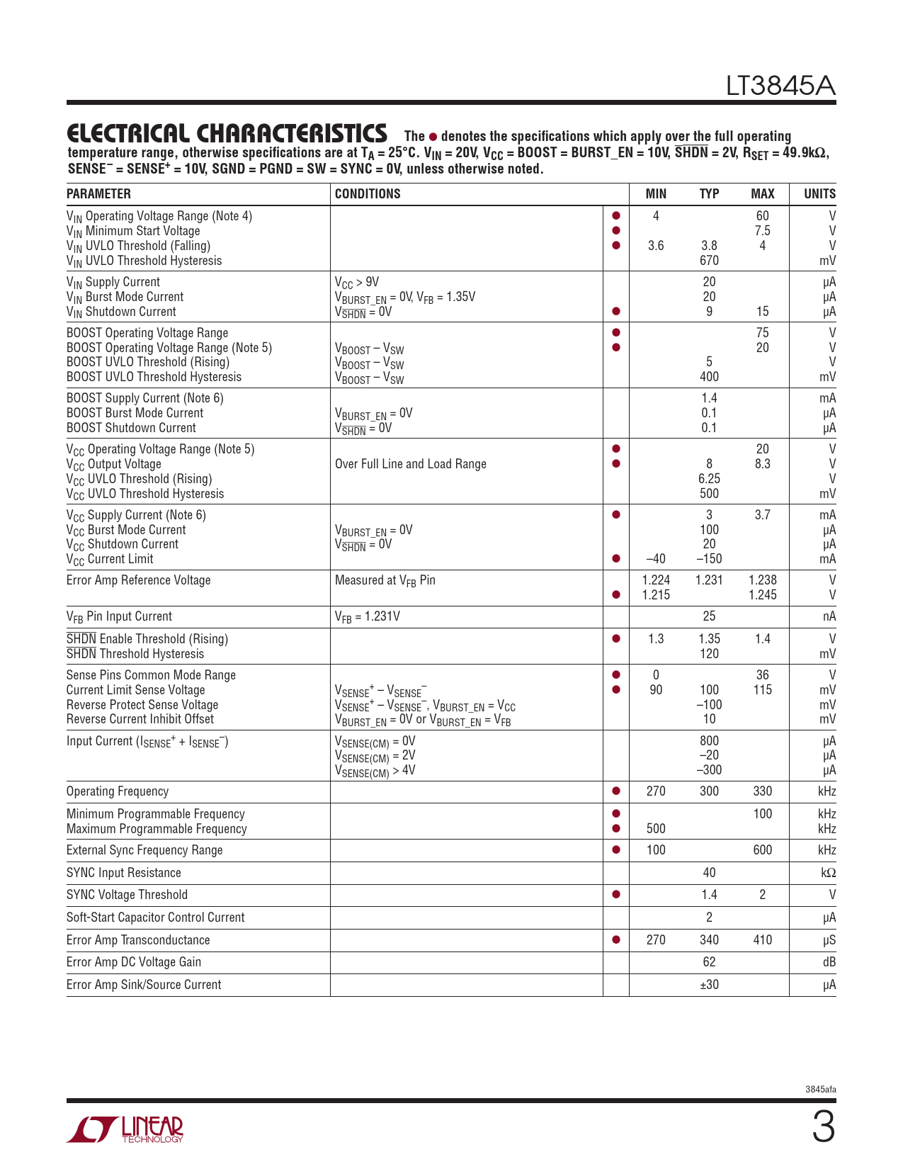 LT3845A ELECTRICAL CHARACTERISTICS The l denotes the specifications which apply over the full operatingtemperature range, otherwise specifications are at TA = 25°C. VIN = 20V, VCC = BOOST = BURST_EN = 10V, SHDN = 2V, RSET = 49.9kΩ,SENSE– = SENSE+ = 10V, SGND = PGND = SW = SYNC = 0V, unless otherwise noted.PARAMETERCONDITIONSMINTYPMAXUNITS VIN Operating Voltage Range (Note 4) l 4 60 V VIN Minimum Start Voltage l 7.5 V VIN UVLO Threshold (Falling) l 3.6 3.8 4 V VIN UVLO Threshold Hysteresis 670 mV VIN Supply Current VCC > 9V 20 µA VIN Burst Mode Current VBURST_EN = 0V, VFB = 1.35V 20 µA VIN Shutdown Current VSHDN = 0V l 9 15 µA BOOST Operating Voltage Range l 75 V BOOST Operating Voltage Range (Note 5) VBOOST – VSW l 20 V BOOST UVLO Threshold (Rising) VBOOST – VSW 5 V BOOST UVLO Threshold Hysteresis VBOOST – VSW 400 mV BOOST Supply Current (Note 6) 1.4 mA BOOST Burst Mode Current VBURST_EN = 0V 0.1 µA BOOST Shutdown Current VSHDN = 0V 0.1 µA VCC Operating Voltage Range (Note 5) l 20 V VCC Output Voltage Over Full Line and Load Range l 8 8.3 V VCC UVLO Threshold (Rising) 6.25 V VCC UVLO Threshold Hysteresis 500 mV VCC Supply Current (Note 6) l 3 3.7 mA VCC Burst Mode Current VBURST_EN = 0V 100 µA VCC Shutdown Current VSHDN = 0V 20 µA VCC Current Limit l –40 –150 mA Error Amp Reference Voltage Measured at VFB Pin 1.224 1.231 1.238 V l 1.215 1.245 V VFB Pin Input Current VFB = 1.231V 25 nA SHDN Enable Threshold (Rising) l 1.3 1.35 1.4 V SHDN Threshold Hysteresis 120 mV Sense Pins Common Mode Range l 0 36 V Current Limit Sense Voltage V + – SENSE – VSENSE l 90 100 115 mV Reverse Protect Sense Voltage V + – SENSE – VSENSE , VBURST_EN = VCC –100 mV Reverse Current Inhibit Offset VBURST_EN = 0V or VBURST_EN = VFB 10 mV Input Current (I + – SENSE + ISENSE ) VSENSE(CM) = 0V 800 µA VSENSE(CM) = 2V –20 µA VSENSE(CM) > 4V –300 µA Operating Frequency l 270 300 330 kHz Minimum Programmable Frequency l 100 kHz Maximum Programmable Frequency l 500 kHz External Sync Frequency Range l 100 600 kHz SYNC Input Resistance 40 kΩ SYNC Voltage Threshold l 1.4 2 V Soft-Start Capacitor Control Current 2 µA Error Amp Transconductance l 270 340 410 µS Error Amp DC Voltage Gain 62 dB Error Amp Sink/Source Current ±30 µA 3845afa 3 Document Outline Features Applications Description Typical Application Absolute Maximum Ratings Pin Configuration Order Information Electrical Characteristics Typical Performance Characteristics Pin Functions Block Diagram Applications Information Typical Applications Package Description Revision History Typical Application Related Parts