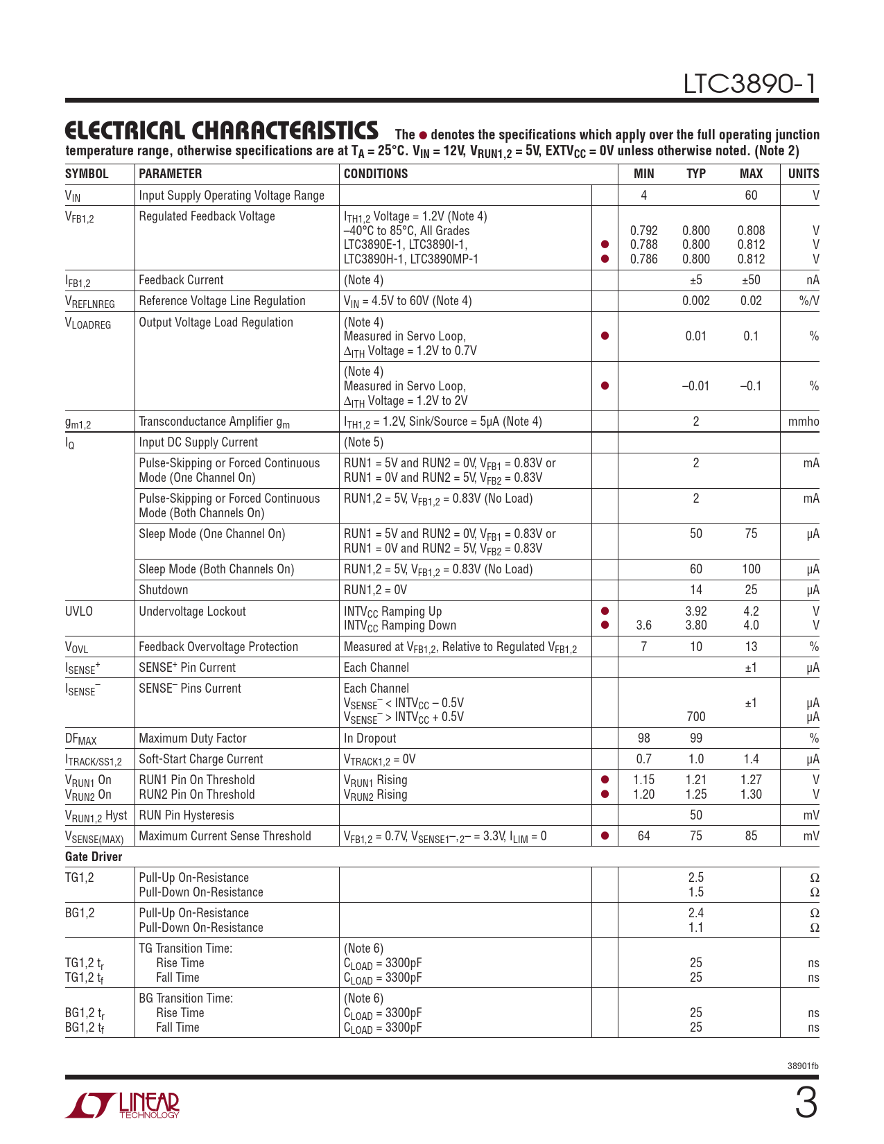 VIN Input Supply Operating Voltage Range 4 60 V VFB1,2 Regulated Feedback Voltage ITH1,2 Voltage = 1.2V (Note 4) –40°C to 85°C, All Grades 0.792 0.800 0.808 V LTC3890E-1, LTC3890I-1, l 0.788 0.800 0.812 V LTC3890H-1, LTC3890MP-1 l 0.786 0.800 0.812 V IFB1,2 Feedback Current (Note 4) ±5 ±50 nA VREFLNREG Reference Voltage Line Regulation VIN = 4.5V to 60V (Note 4) 0.002 0.02 %/V VLOADREG Output Voltage Load Regulation (Note 4) Measured in Servo Loop, l 0.01 0.1 % ∆ITH Voltage = 1.2V to 0.7V (Note 4) Measured in Servo Loop, l –0.01 –0.1 % ∆ITH Voltage = 1.2V to 2V gm1,2 Transconductance Amplifier gm ITH1,2 = 1.2V, Sink/Source = 5µA (Note 4) 2 mmho IQ Input DC Supply Current (Note 5) Pulse-Skipping or Forced Continuous RUN1 = 5V and RUN2 = 0V, VFB1 = 0.83V or 2 mA Mode (One Channel On) RUN1 = 0V and RUN2 = 5V, VFB2 = 0.83V Pulse-Skipping or Forced Continuous RUN1,2 = 5V, VFB1,2 = 0.83V (No Load) 2 mA Mode (Both Channels On) Sleep Mode (One Channel On) RUN1 = 5V and RUN2 = 0V, VFB1 = 0.83V or 50 75 µA RUN1 = 0V and RUN2 = 5V, VFB2 = 0.83V Sleep Mode (Both Channels On) RUN1,2 = 5V, VFB1,2 = 0.83V (No Load) 60 100 µA Shutdown RUN1,2 = 0V 14 25 µA UVLO Undervoltage Lockout INTVCC Ramping Up l 3.92 4.2 V INTVCC Ramping Down l 3.6 3.80 4.0 V VOVL Feedback Overvoltage Protection Measured at VFB1,2, Relative to Regulated VFB1,2 7 10 13 % I + SENSE SENSE+ Pin Current Each Channel ±1 µA I – SENSE SENSE– Pins Current Each Channel V – SENSE < INTVCC – 0.5V ±1 µA V – SENSE > INTVCC + 0.5V 700 µA DFMAX Maximum Duty Factor In Dropout 98 99 % ITRACK/SS1,2 Soft-Start Charge Current VTRACK1,2 = 0V 0.7 1.0 1.4 µA VRUN1 On RUN1 Pin On Threshold VRUN1 Rising l 1.15 1.21 1.27 V VRUN2 On RUN2 Pin On Threshold VRUN2 Rising l 1.20 1.25 1.30 V VRUN1,2 Hyst RUN Pin Hysteresis 50 mV VSENSE(MAX) Maximum Current Sense Threshold VFB1,2 = 0.7V, VSENSE1–,2– = 3.3V, ILIM = 0 l 64 75 85 mV